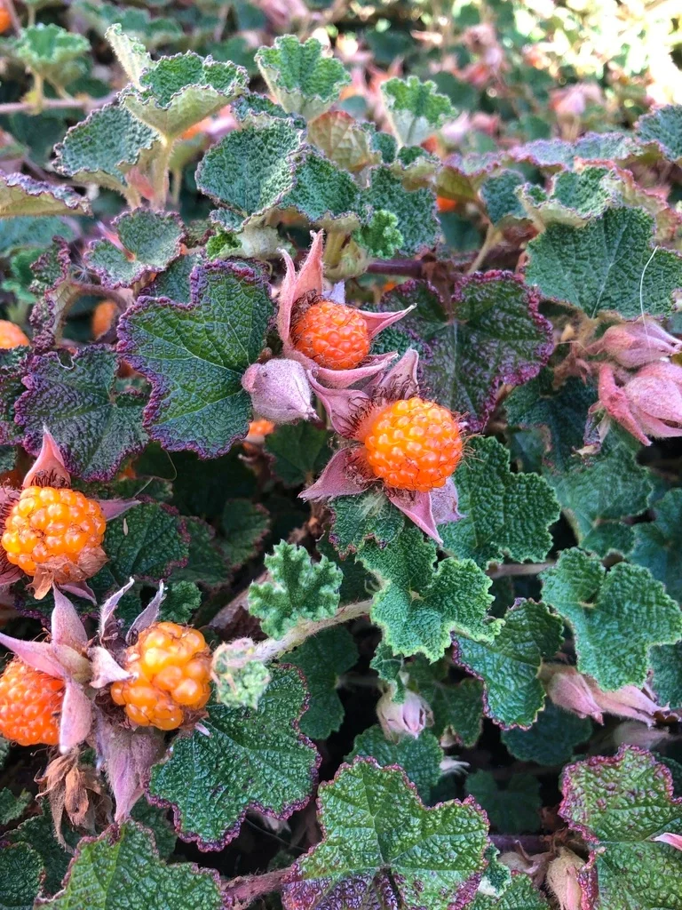 一种匐匍性亚灌木,叶圆心形,叶面皱缩状,冬季叶变红黄色,背面有褐色毛茸,托叶为掌状,茎节上会长出不定根,春夏开白花,秋季为果熟期,分布于二千公尺到三千八百公尺高海拔山区,生长在岩屑地,裸露地。 我最喜欢的地方: [偷笑R][偷笑R]单株结果、果子可食用,味甜。虽然它是台湾的高山品种,但它非常耐热,可以耐30多度高温,冬季叶子会变红黄色,非常漂亮有观赏性。是非常理想的阳台浆果,开花需要冷量的支持。 超爱这个品种[色色R][色色R]