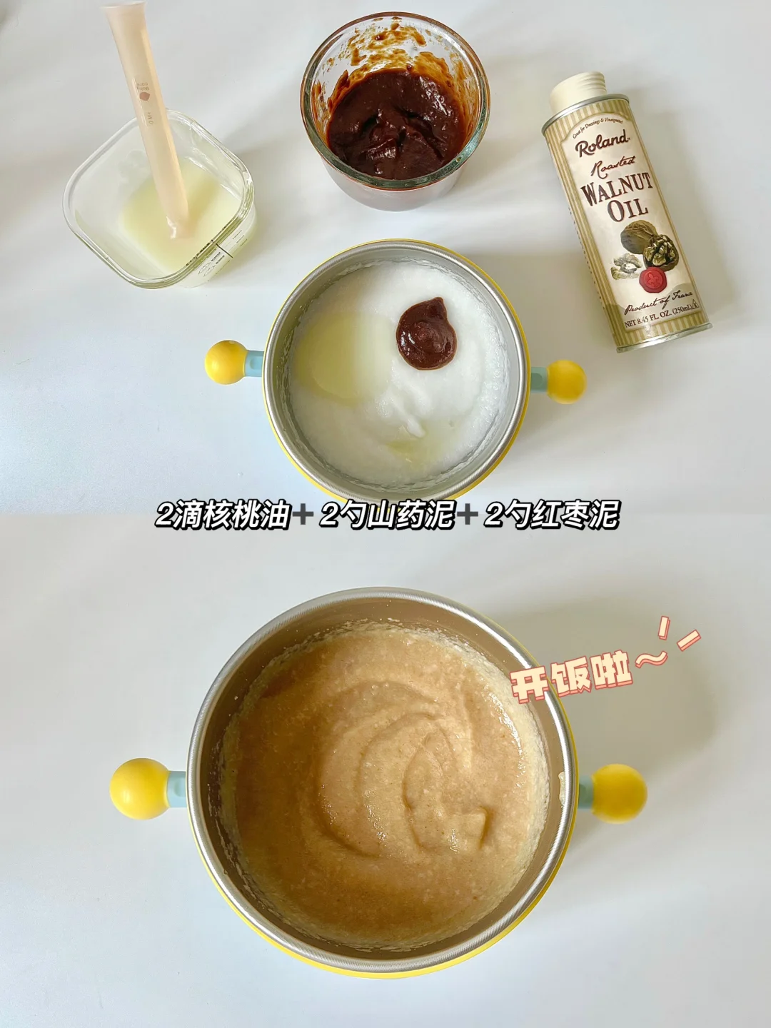 📝:10g米粉➕90ml水➕2滴核桃油➕2勺山药泥➕1勺红枣泥