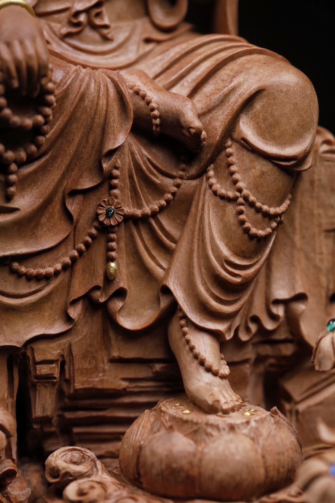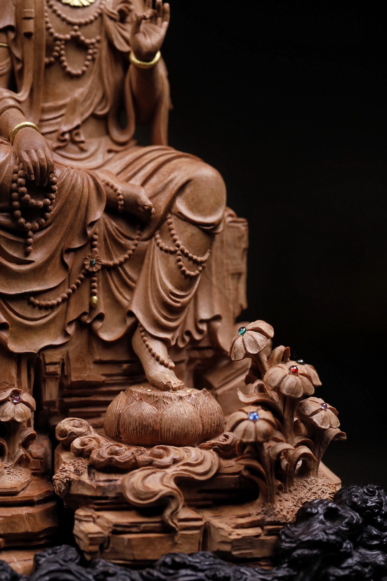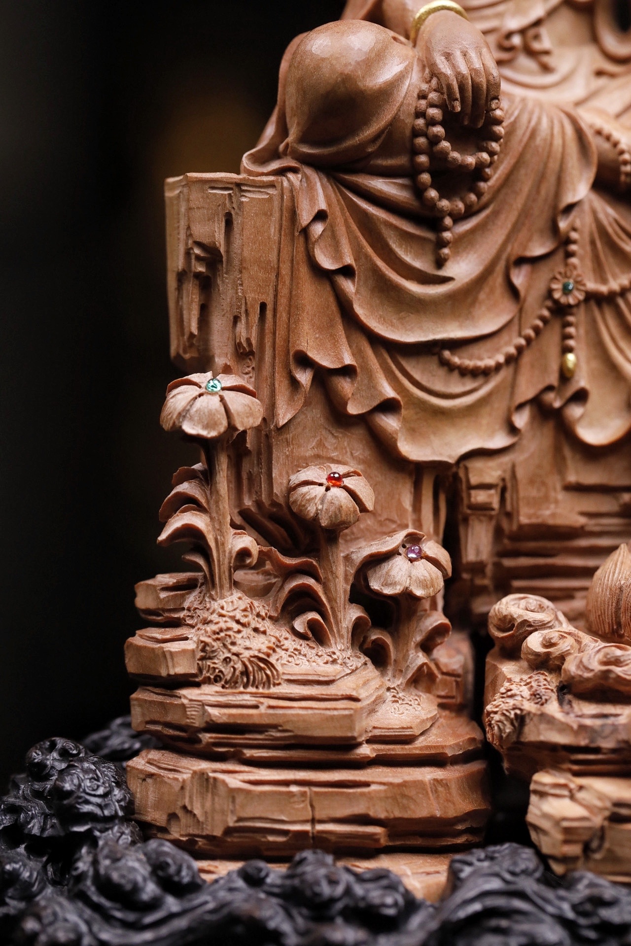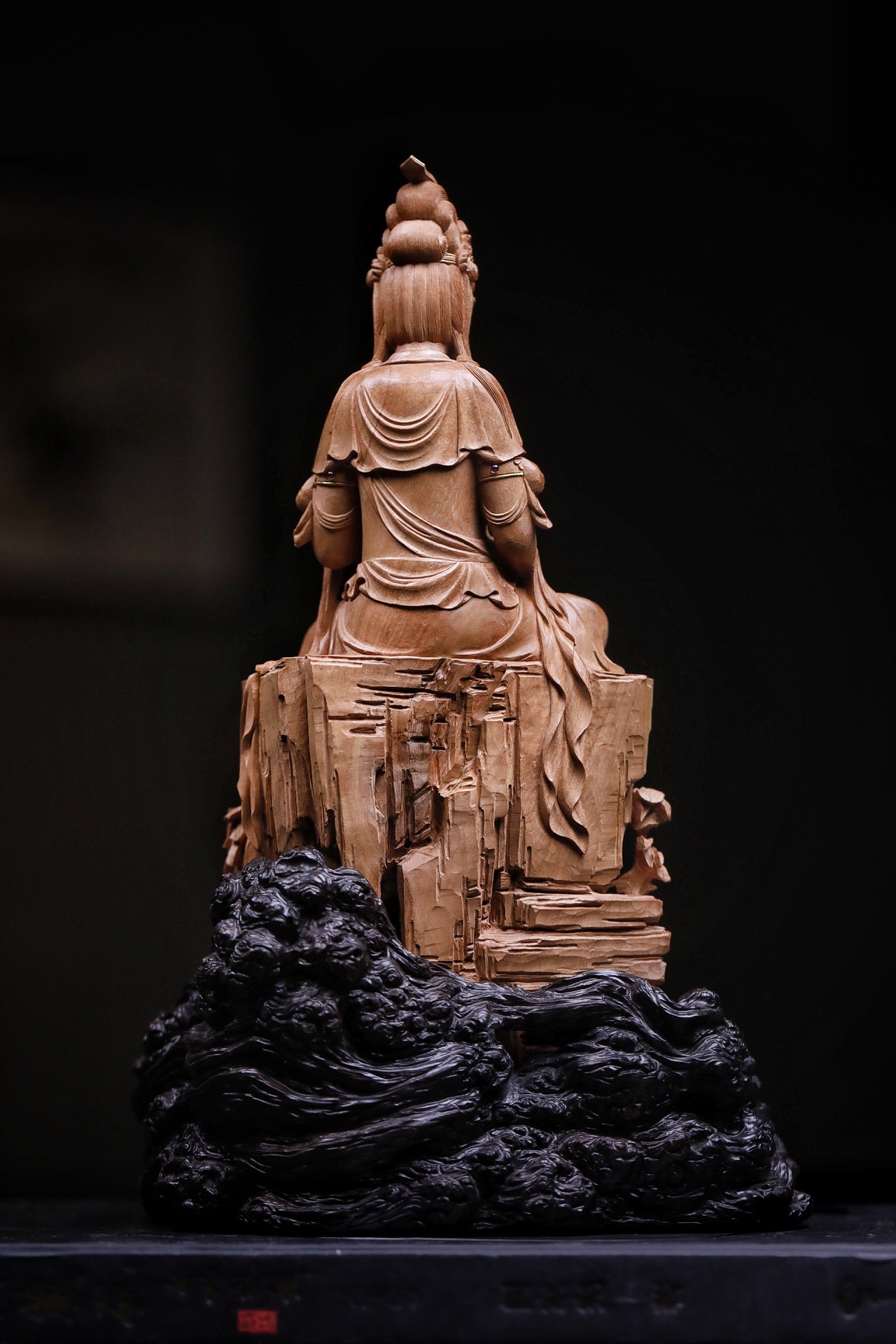 老山檀香|持珠观音·清刀制像取整料成器,雕观音自在趺坐,手持念珠、颔首垂目,面容温婉慈悲,衣袂层叠如流云。木雕细节毕现,璎珞、莲台雕琢精巧,檀香醇厚沁脾,兼具观瞻之美与禅修之韵,为收藏重器。规格:13×10×23cm重量490g底座:19×12×10cm整体高度27cm