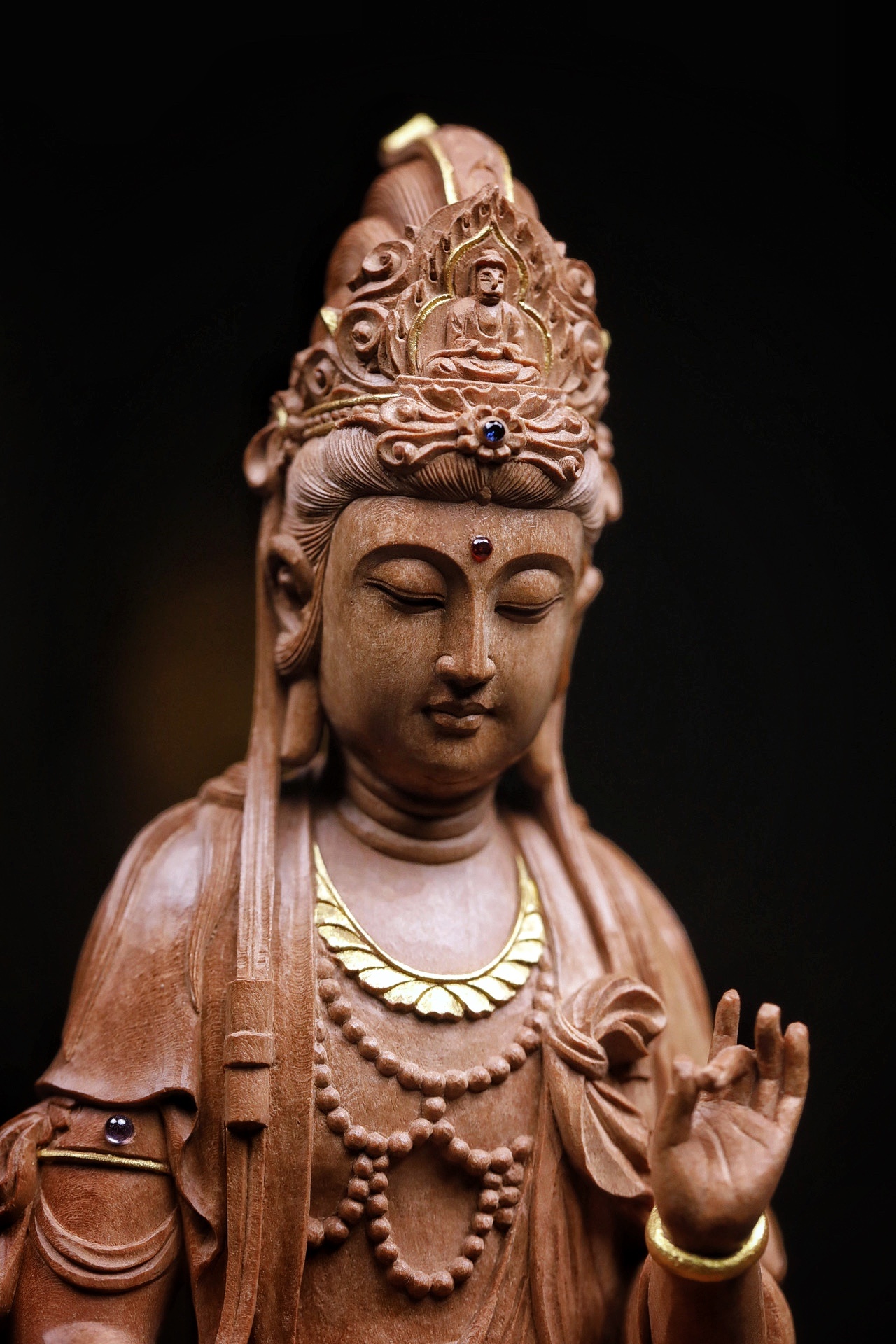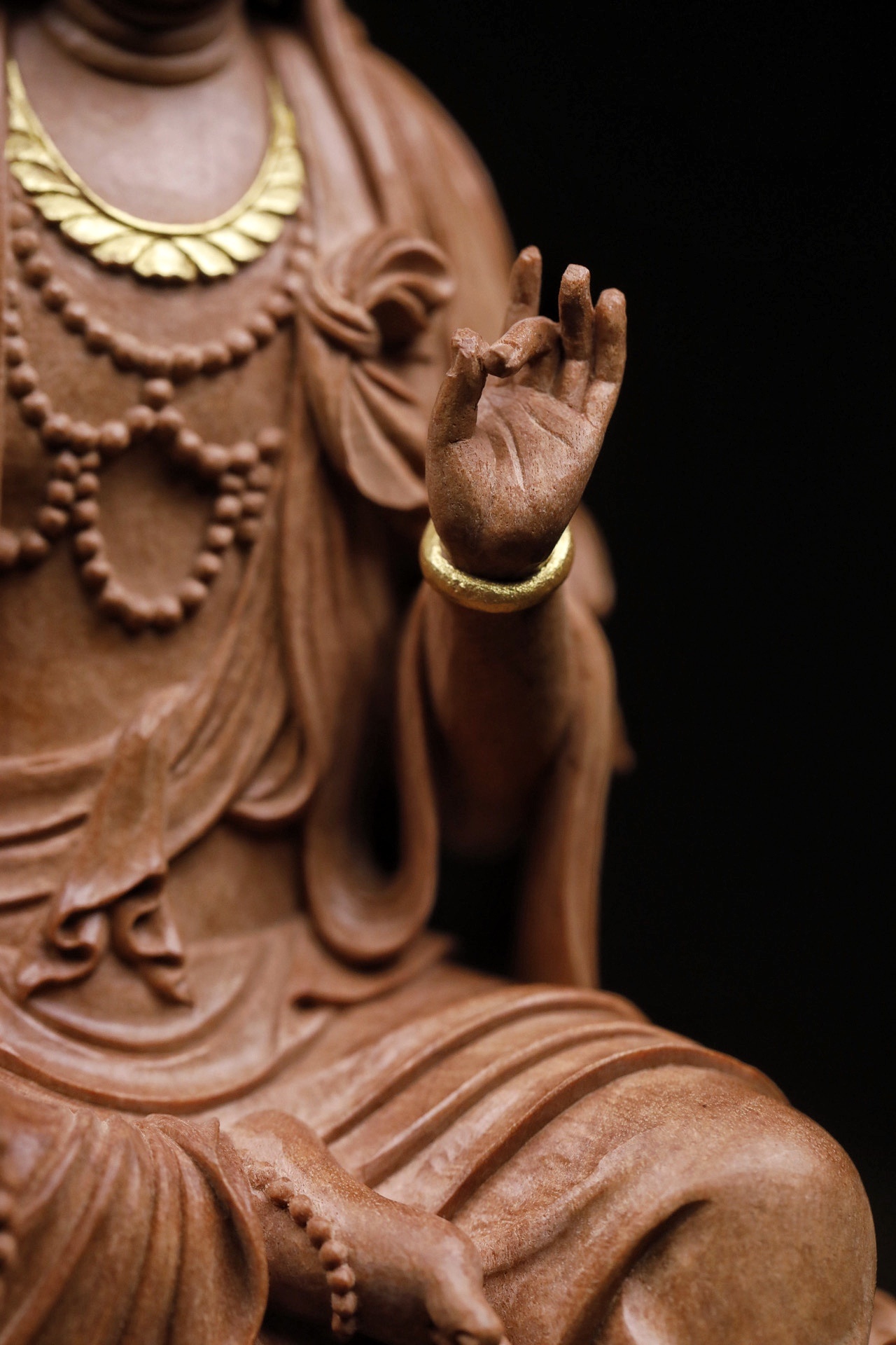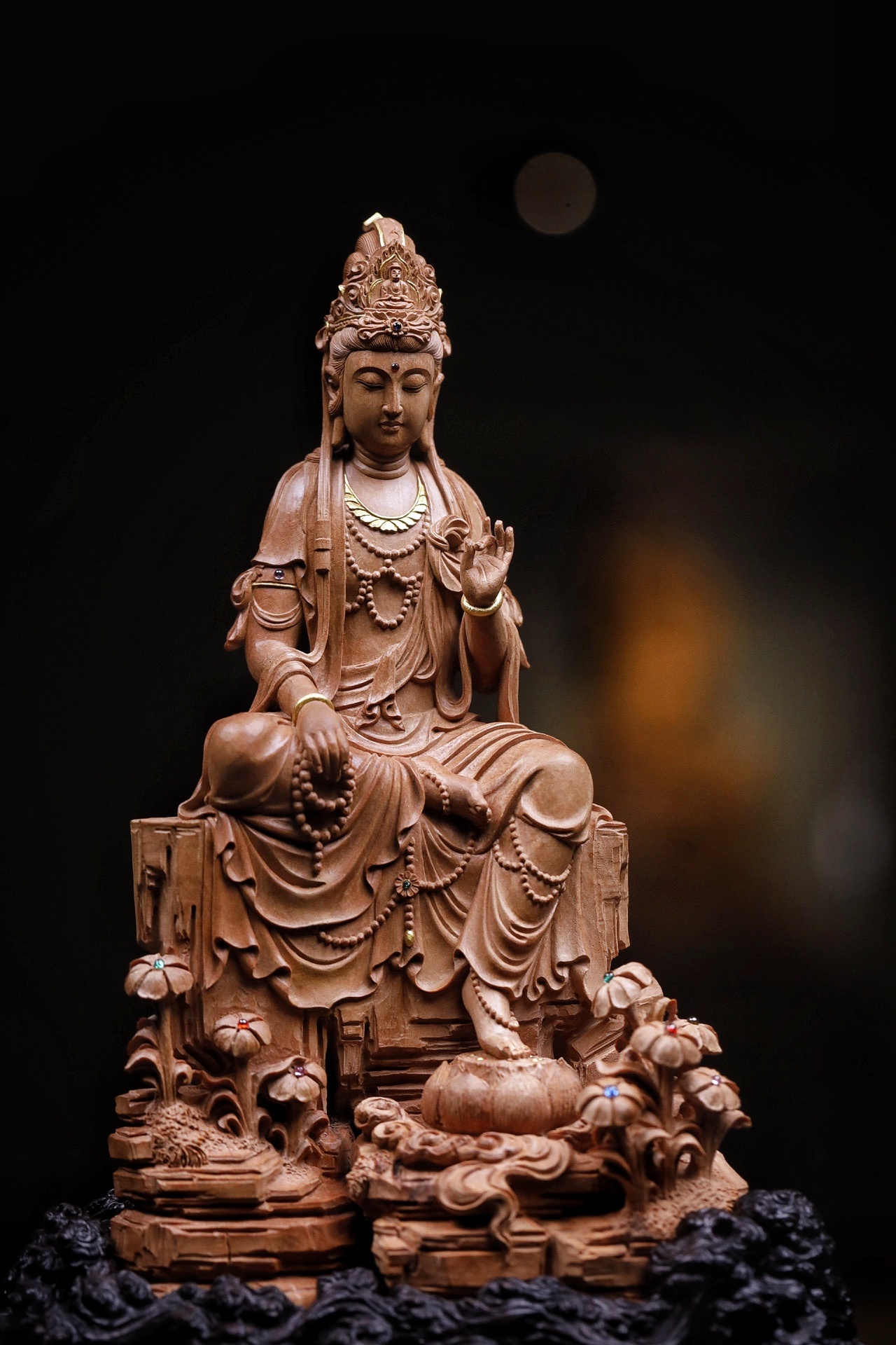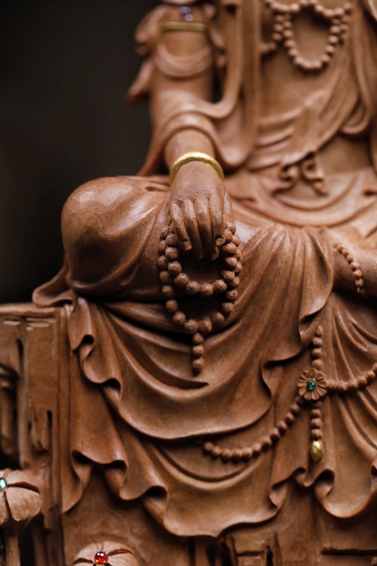 老山檀香|持珠观音·清刀制像取整料成器,雕观音自在趺坐,手持念珠、颔首垂目,面容温婉慈悲,衣袂层叠如流云。木雕细节毕现,璎珞、莲台雕琢精巧,檀香醇厚沁脾,兼具观瞻之美与禅修之韵,为收藏重器。规格:13×10×23cm重量490g底座:19×12×10cm整体高度27cm