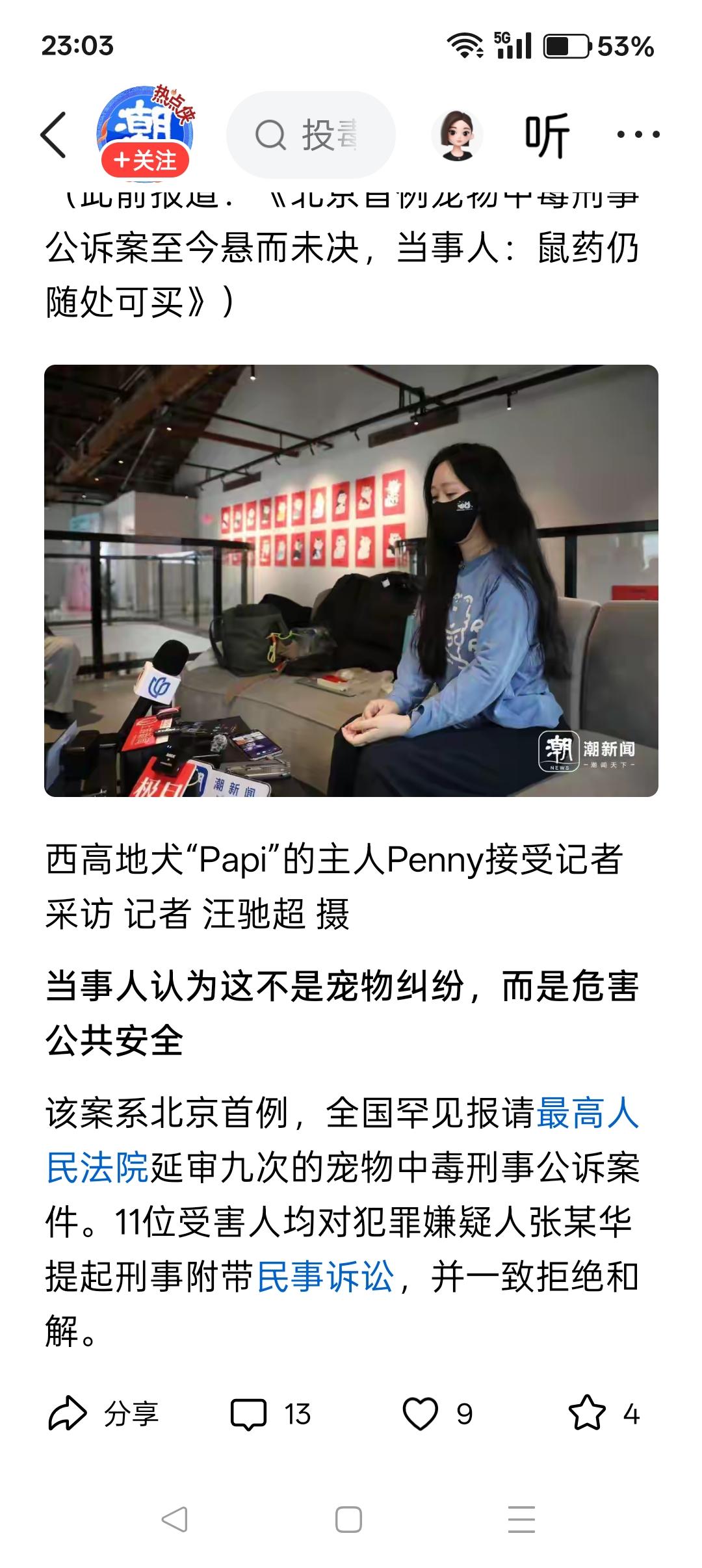 北京首例宠物中毒刑事公诉案明日宣判,狗主人:我认为他危害公共安全。 极端爱狗人士,坚决咬定是危害公共安全。如果硬要较真的话,恐怕狗主人也触犯危害公共安全罪。 11位狗主人都认为这不是单纯宠物纠纷,而是危害公共安全的犯罪,投毒区域人员密集,直接威胁儿童及居民人身安全,且全部拒绝和解,提起刑事附带民事诉讼 。 既然狗主人在乎儿童及居民人身安全,那么自己为什么不守规矩养狗遛狗呢(比如遛狗时戴嘴套、拴绳)? 必须指出,已有太多案例证明不守规矩养狗遛狗对他人有威胁,不少人因此受伤、致残甚至丧命。 狗吃了毒物丧命,就证明狗主人遛狗未拴绳尤其是未戴嘴套。 可以在一定程度上说,狗主人有碰瓷之嫌疑。出门不戴嘴套,对他人对狗都有风险。狗主人却放任可能发生的风险(比如吃路边有毒有害的东西),这不是碰瓷又是什么? 我们完全可以相信张某华没有毒害他人的心思,唯一的根源是不守规矩养狗遛狗(比如害怕狗咬他的孙女、狗往他的车撒尿等),烦扰了他。 至于说他的做法威胁儿童及居民人身安全,这说法没有客观根据,是狗主人的主观臆断,因为他只是把吃剩的鸡脖子剁碎扔到狗常出没的场合——成年人不可能捡地上的、别人吃过的鸡碎骨吃,即使是现在的小孩也不喜欢捡地上的东西吃。 狗主人这样说,目的是为了渲染严重性,同时掩盖自身不拴绳不戴嘴套的危害性,诱导舆论。 狗主人提了最重要的要求——多达几十万的巨额赔偿!包括狗的市场价、中毒抢救费、丧葬费、精神损失费。但是张某华拒赔,如果如他们所愿,估计就不追究刑责了。 这些要求来自于狗的死亡,很不正常。狗是财物,不是人。这些费用名目站不住脚。 还有一个不能理解的事,狗主人在狗死后三年多,都没上班,坚持为狗守孝,至今提到她的狗都“悲伤不已”。这太反常了,不要说一条狗,就是她的爹妈死了这么久了,都不至于还如此悲伤吧。表演炒作得太过。 俗话说,得饶人处且饶人。不依不饶几年,狗主人恐怕也不一定是善良厚道的人。 如果张某华的碎鸡脖确实毒害了他人,判他重刑无可厚非。而只是毒害了不守规矩养的狗,由于狗主人穷追猛打,就从重追责,未免过度啊。