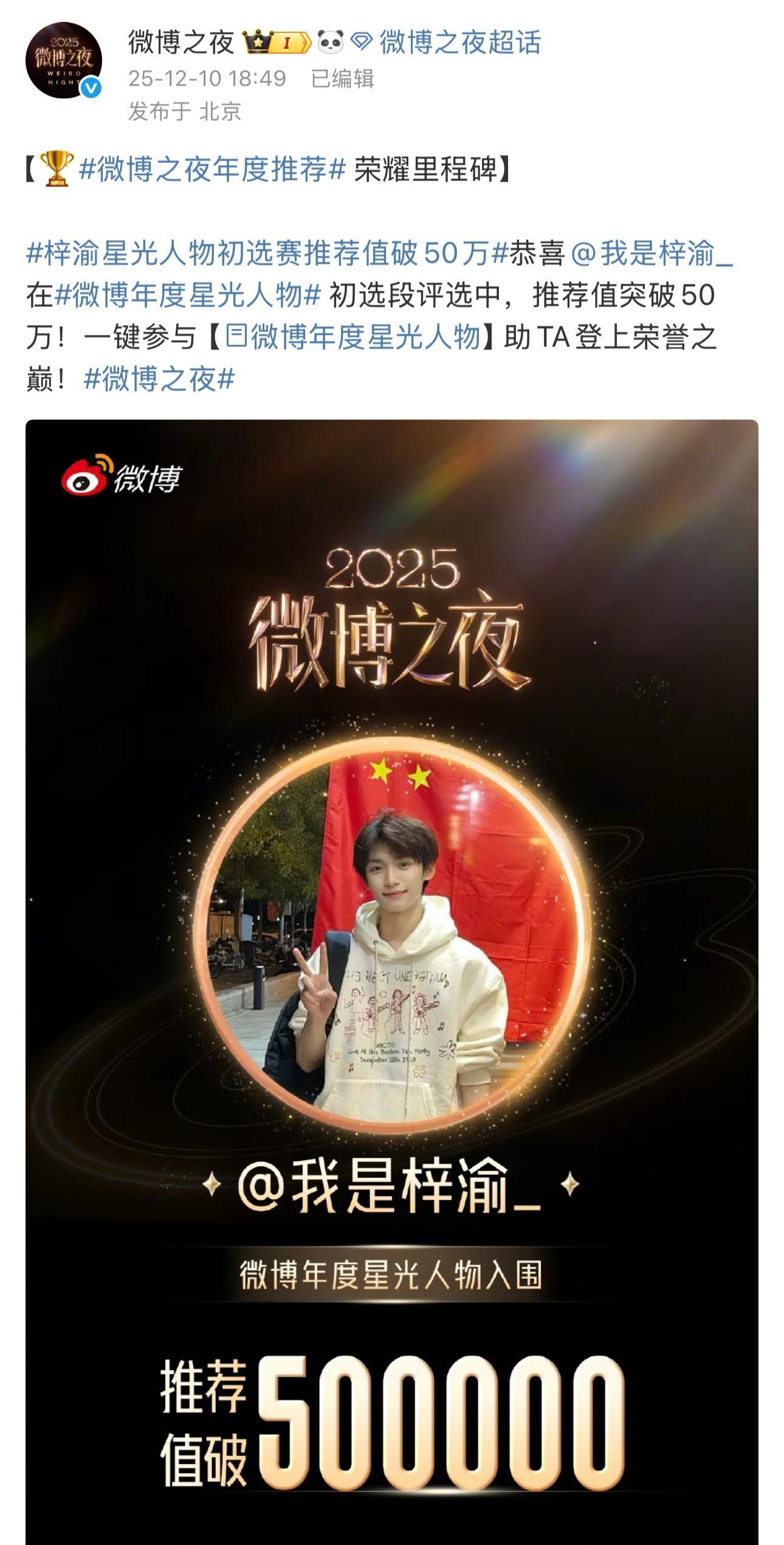 梓渝微博之夜星光人物推荐值破100万。。十四分钟突破50万,两小时突破100万🔥🔥