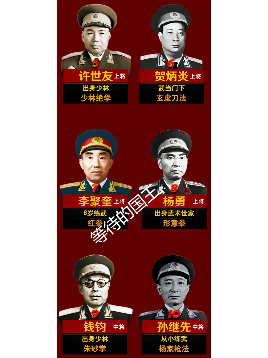陈 赓:功夫最高的大将。 许世友:功夫最高的上将。 钱 钧:功夫最高的中将。 如图所示,开国将帅中的“十大武林高手”一览图。从出身来看,有的来自武术世家,有的来自少林,有的来自武当……从擅长招数来看,有武当拳法,有八卦连环掌,还有刀法、枪法……可以说他们个个都是武林高手,哪怕没有参军,也会成为行侠仗义的大侠。值得一提的是许世友将军,曾7次参加敢死队,凭借一身功夫在枪林弹雨中杀敌无数,并且每次都能化险为夷全身而退。