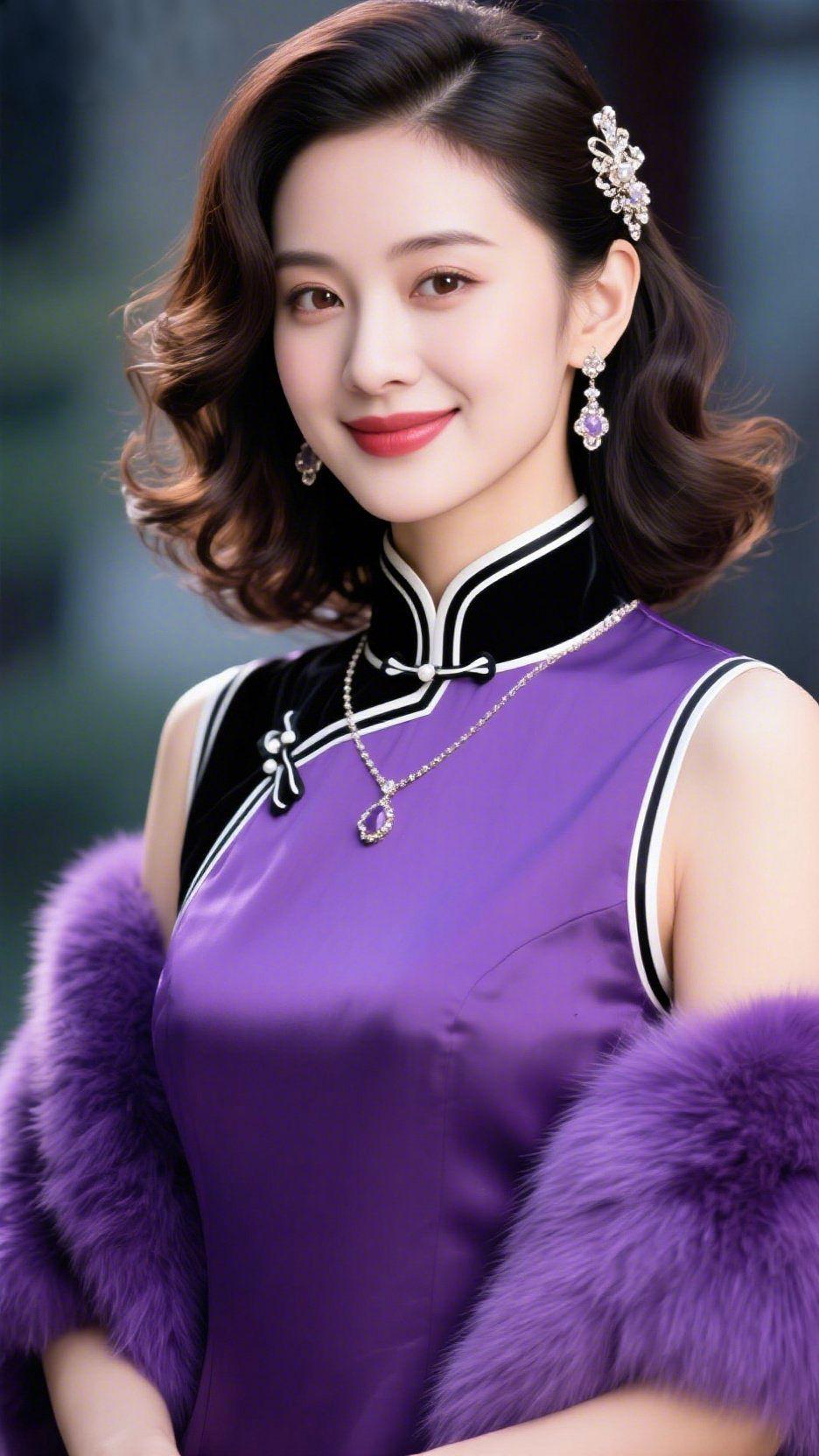 紫衫娴仪 柔紫旗袍裹着缎面的润光,黑绒镶边与银扣相衬,像把暮春的紫藤色裁作了衣身。肩头绒絮软得似拢了层轻雾,发间银饰曳着细光,同耳坠的紫晶缠成温雅的簇。 她笑时,唇色与衣色融作浅淡的柔艳,眉眼间的舒展像浸了暖光的水——没有张扬的灼感,只有妥帖的娴静,像旧时光里浸过书卷的温婉,又裹着几分恰好的鲜活。 原来雅意从不是冷寂的端方,是一身衬人的紫衫,配着眼底的温软,便成了心上难忘的娴静帧。 中式雅韵穿搭 紫调旗袍美学