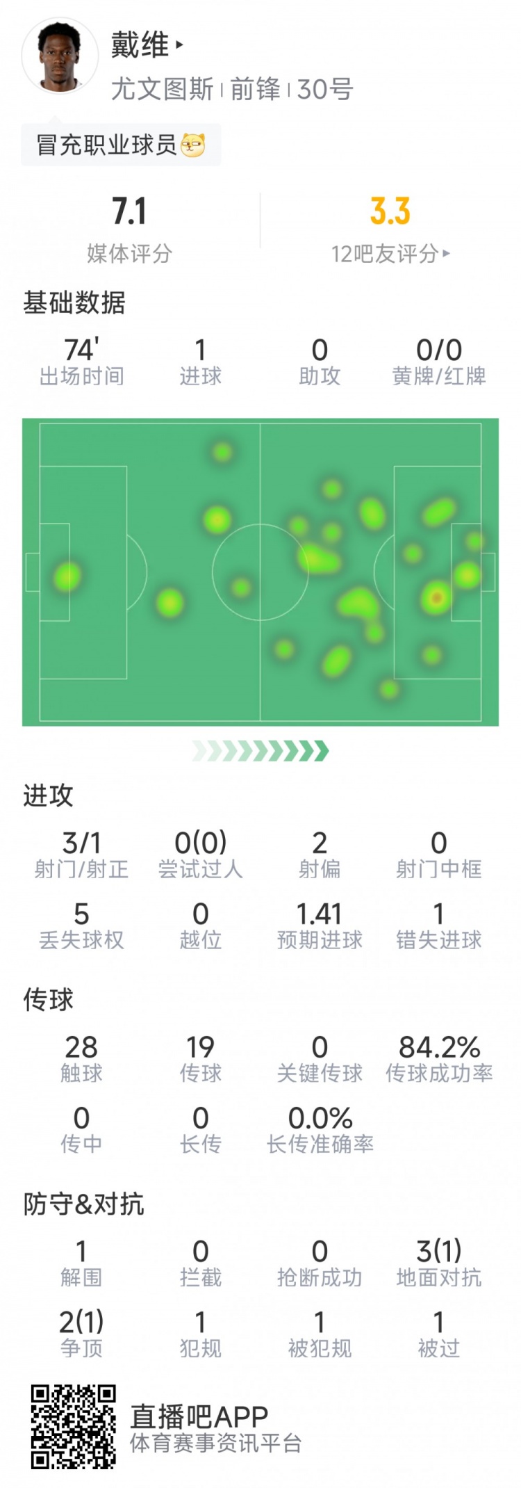 直播吧12月11日讯在本轮欧冠尤文对阵帕福斯的比赛中,戴维破门,以下为他在本场数据: