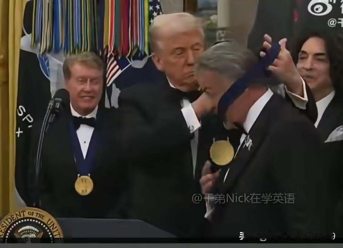 八十岁的特朗普依然活力满满,竟然亲自主持了肯尼迪中心荣誉奖颁奖典礼,这也开创了总统主持该典礼的先例。如果不是因为他主持,我至今还不知道有这样一个“肯尼迪中心荣誉奖”呢! 巧合的是,今年的获奖者之一竟是与特朗普同岁的史泰龙。中学时看他的《第一滴血》,硬汉形象深入人心,至今记忆犹新。如今两位年近八十的传奇人物同台亮相,依然精神矍铄、气场十足,丝毫不见老态,实在让人羡慕不已。 (图片来自网络)
