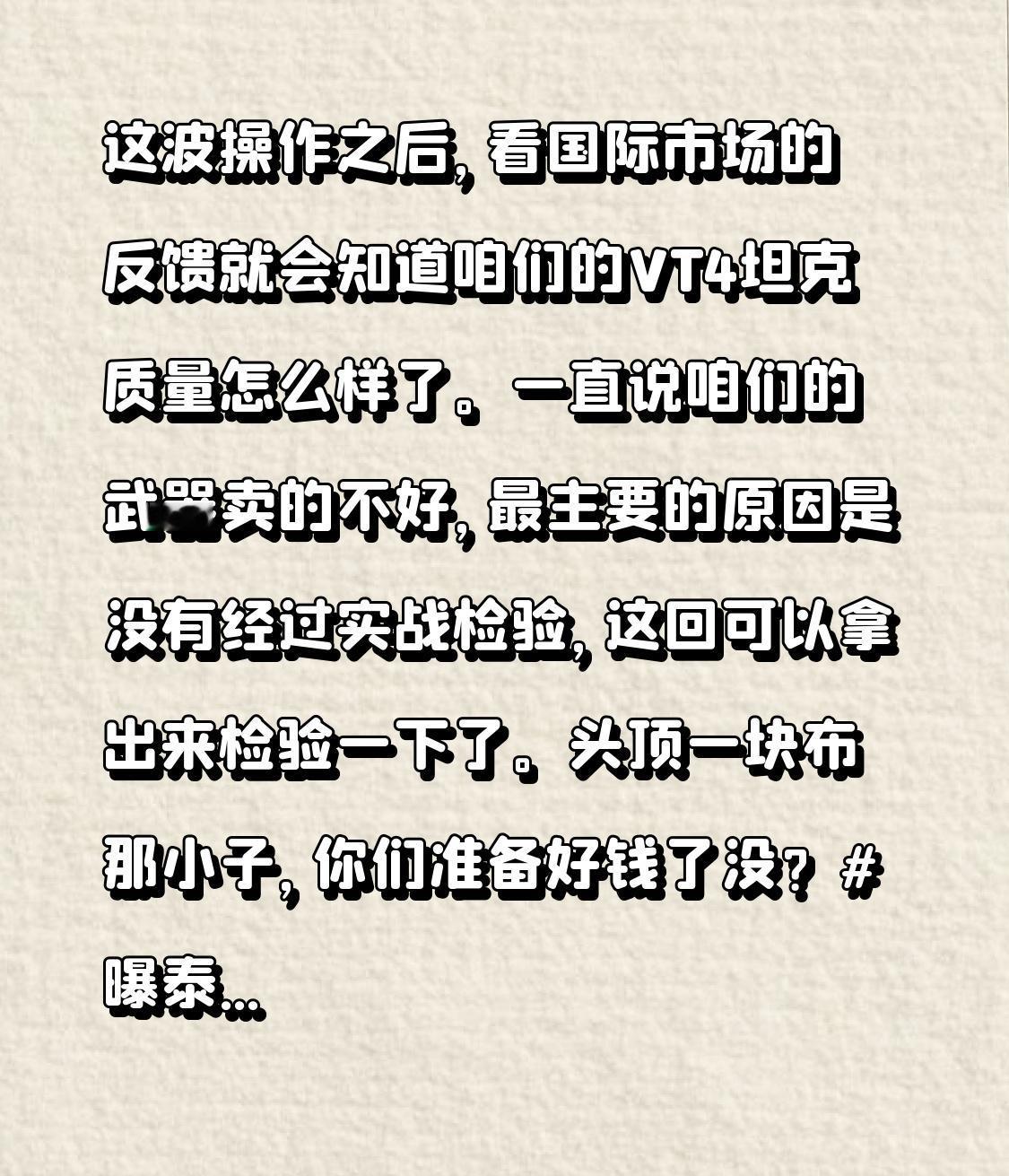 这波操作之后,看国际市场的反馈就会知道咱们的VT4坦克质量怎么样了。一直说咱们的武器卖的不好,最主要的原因是没有经过实战检验,这回可以拿出来检验一下了。头顶一块布那小子,你们准备好钱了没?