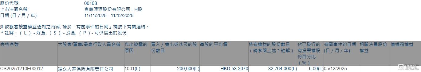 格隆汇12月11日丨根据联交所最新权益披露资料显示,2025年12月5日,青岛啤酒股份(00168.HK)获瑞众人寿保险有限责任公司在场内以每股均价53.207港元增持20万股,涉资约1064.14万港元。