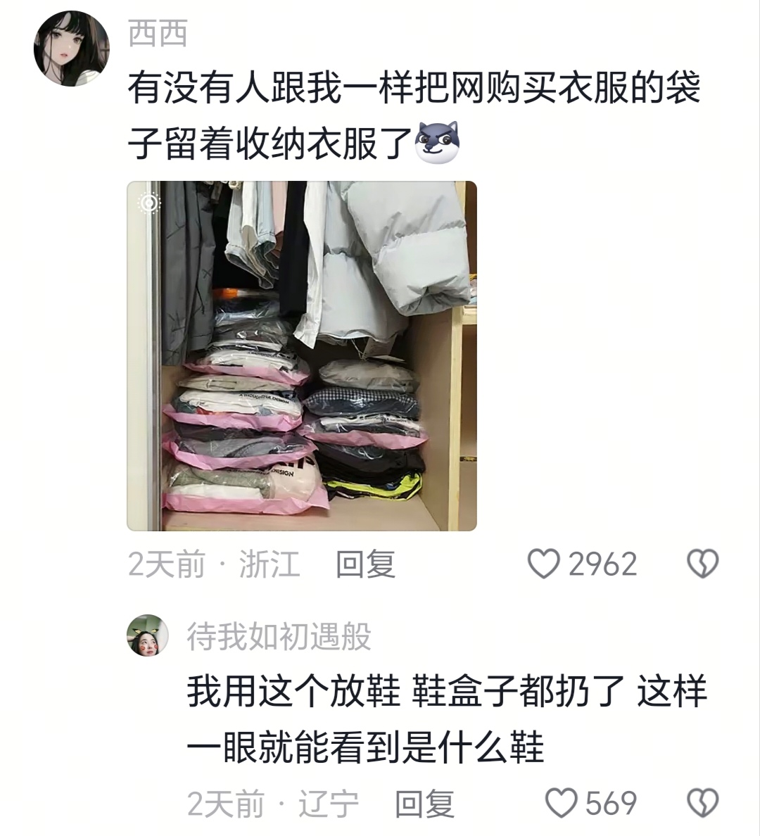 有没有人跟我一样把网购买衣服的袋子,留着收纳衣服了