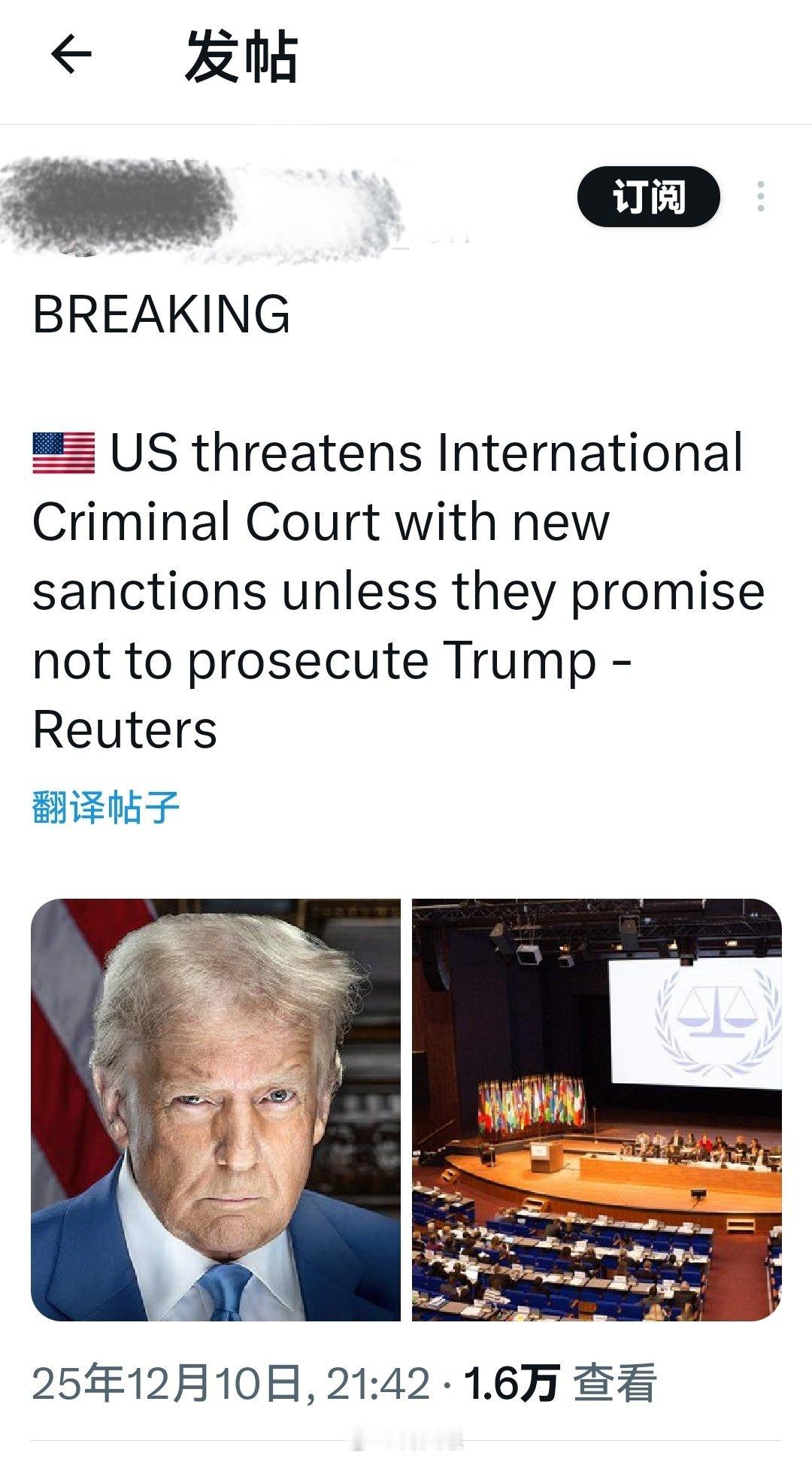 突发消息:美国威胁国际刑事法院,除非承诺不起诉特朗普,否则将对其实施新的制裁 ——路透社海外新鲜事何天恩
