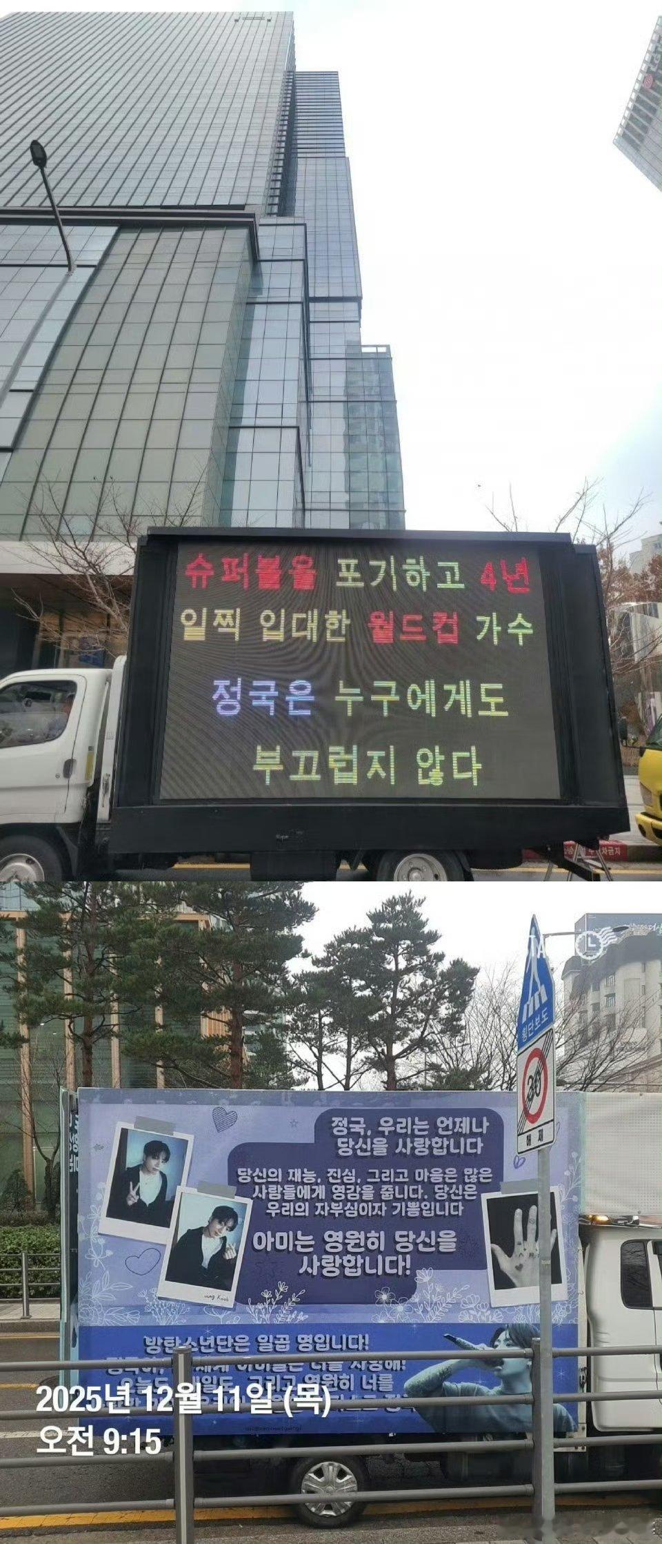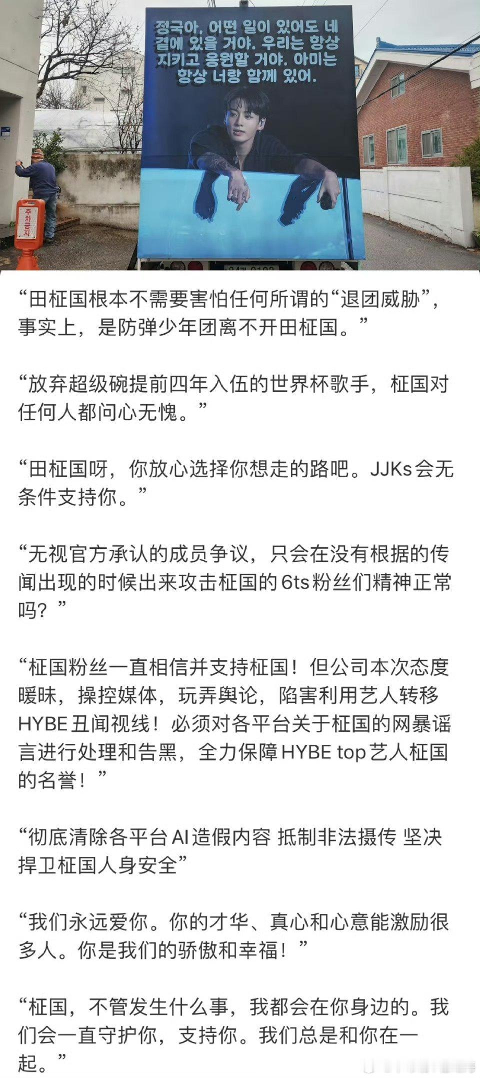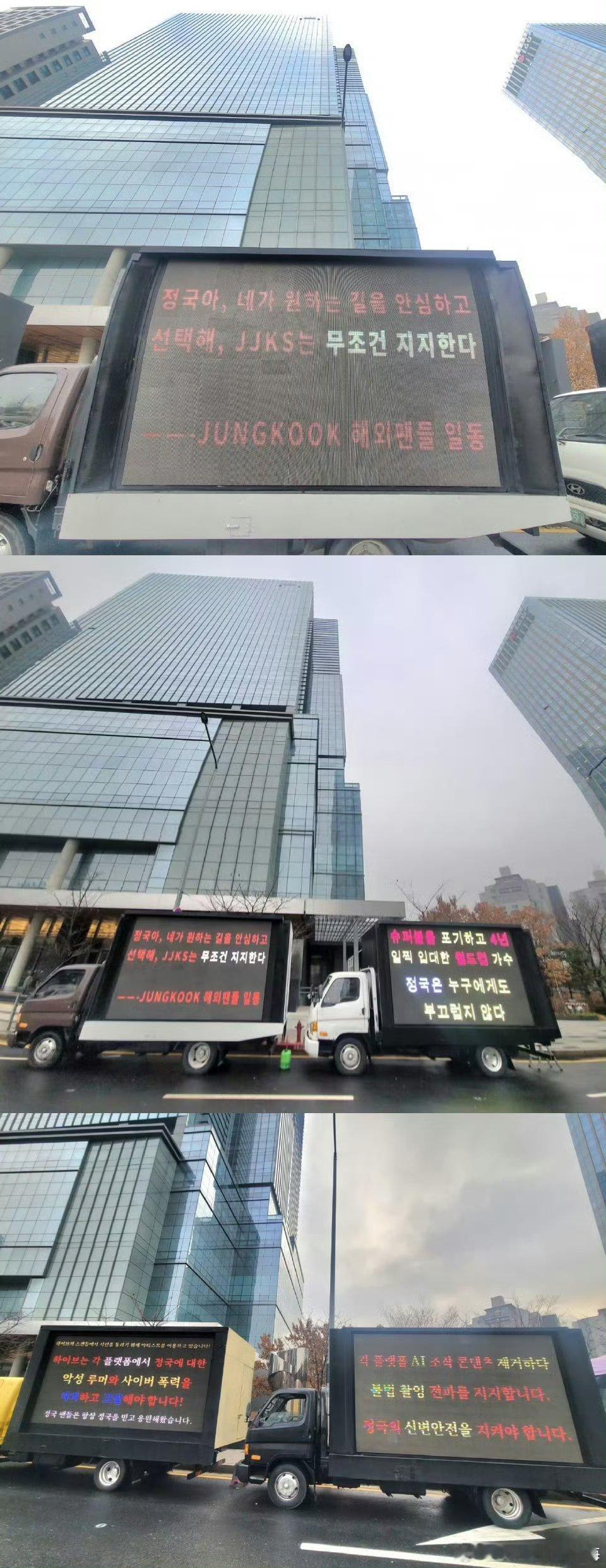 今天田柾国粉丝开了七辆卡车到hybe楼下维权