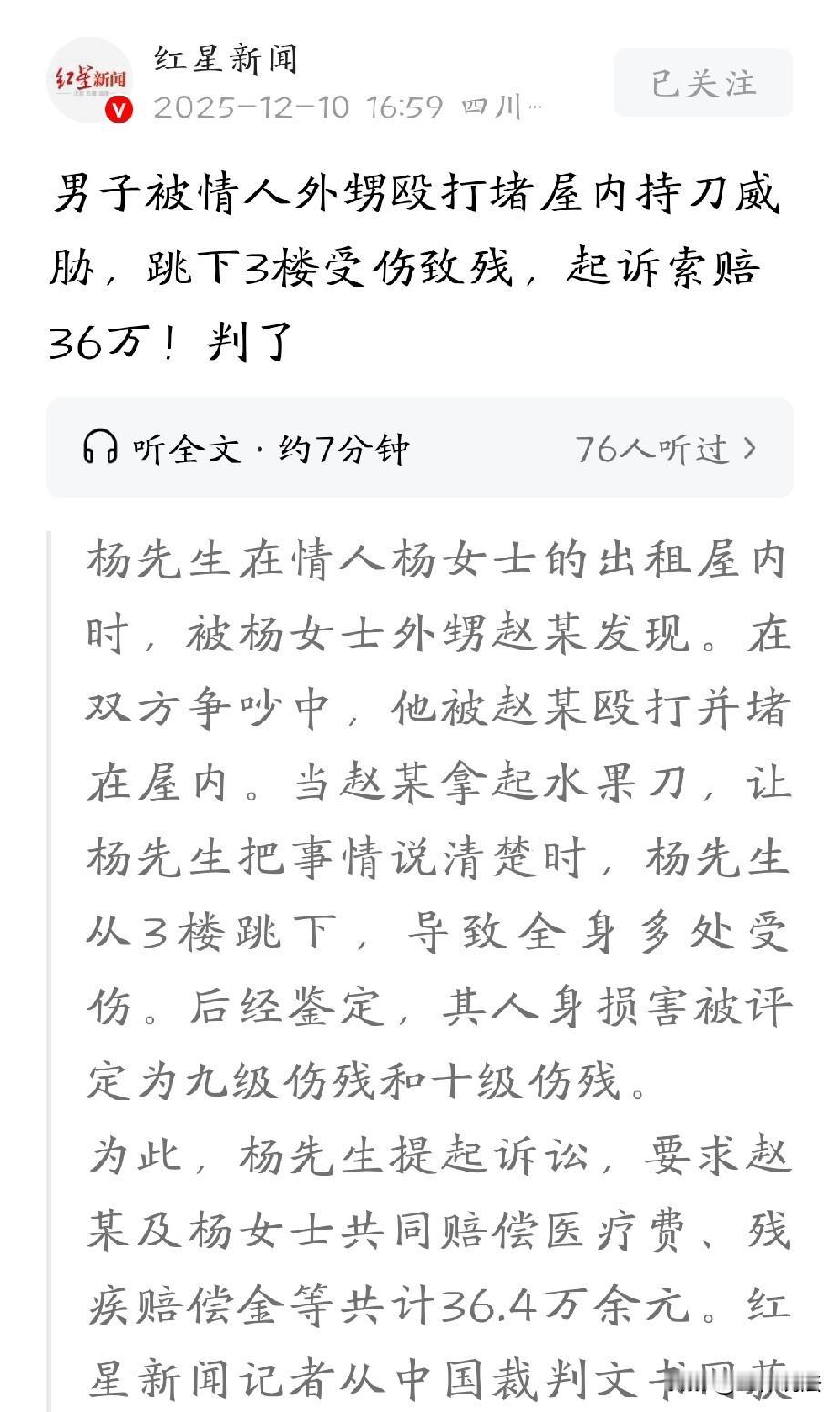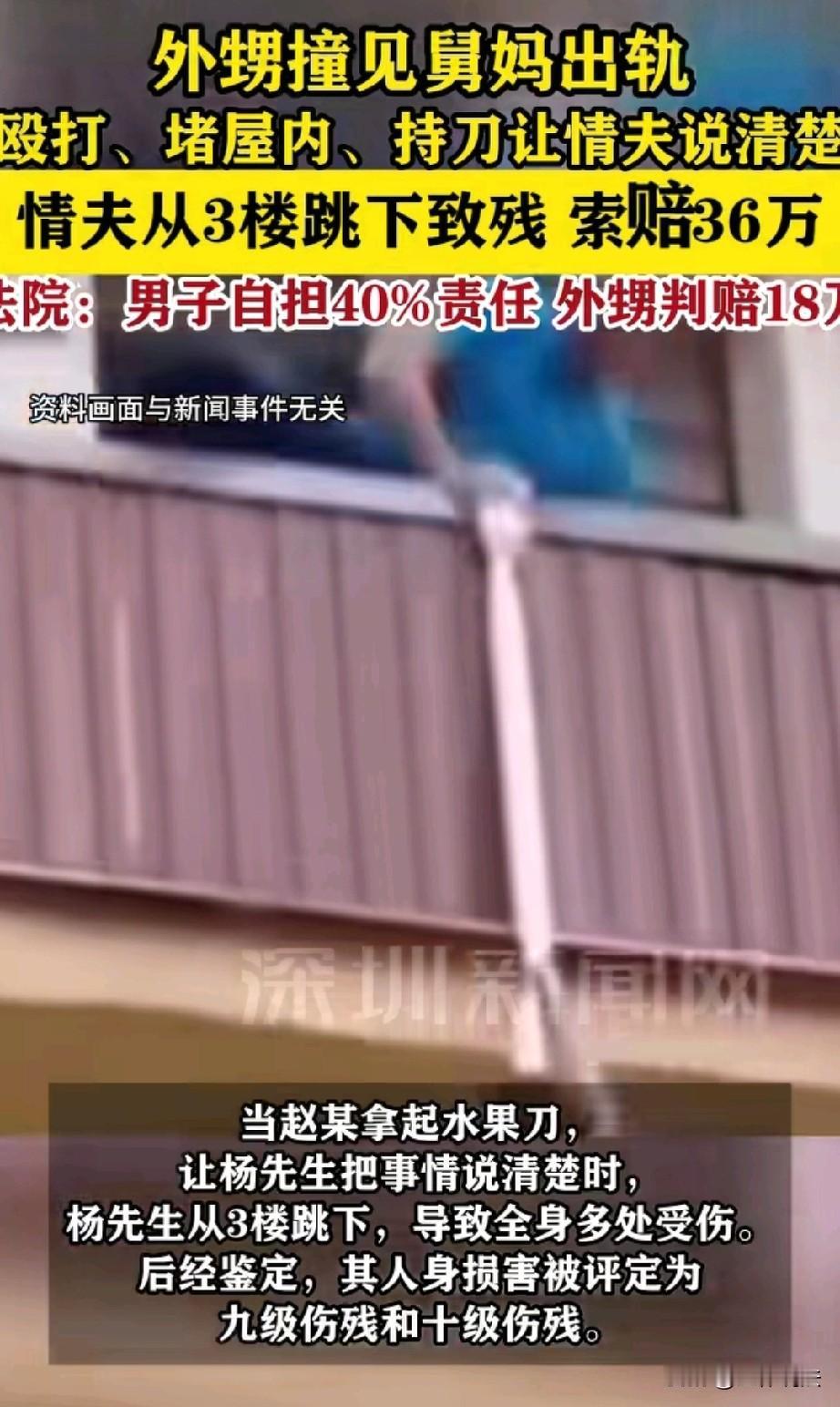 云南玉溪,男子在情人出租屋喝酒时,被情人外甥发现,外甥察觉到他和舅妈关系不正常,便将男子暴揍一顿,还堵到屋里,让他把事情说清楚,甚至拿起水果刀威胁。男子怕对方冲动之下伤他性命,一着急竟直接从3楼跳下,导致全身多处骨折,住院40多天,被评定为九级伤残。受了疼还花了那么多钱,这口气男子咽不下,他果断将情人外甥告上法庭,索赔36.4万余元,法院判了。 2024年6月份,36岁的男子杨某和43岁的女子周某在玉溪市打工时偶然相识。 尽管周某已有家庭,可两人还是没抵住诱惑,发展成了情人关系,杨某有时还会前往周某的出租房与她同居生活。 去年10月22日,杨某像往常一样来到周某的出租房吃饭喝酒,晚上9点多,周某的外甥赵某来到出租房找她。 一进门,赵某看见杨某在房间里,心里顿时觉得不对劲,便质问两人究竟是什么关系,还让杨某把事情说清楚。 杨某心里发虚,低着头一声不吭,转身就想离开房间,赵某哪能让他轻易走掉,一下子就拦住了他。 两人随即你一言我一语地争吵起来,赵某越想越气,情绪激动之下,动手殴打了杨某的头部和鼻部。 杨某只感觉脑袋“嗡”的一下,鼻子一阵剧痛,鲜血顺着鼻孔流了下来。 可赵某仍不解气,又把杨某推倒在床上,双手死死地掐住他的脖子,杨某感觉呼吸愈发困难,双手拼命地挣扎着。 好不容易从床上挣脱后,他慌慌张张地往门口跑去,想赶紧逃离这个危险之地,然而,赵某却堵在门口,根本不让他出去,又把他推回了屋内。 赵某怒气未消,从桌上抓起一把水果刀,恶狠狠地指着杨某,再次叫他把事情说清楚。 当时杨某站在窗户附近,心里害怕极了,周某见状,赶忙上前把赵某拉到门口,试图让他冷静下来。 此时的杨某,看着凶神恶煞般的赵某,觉得自己再不逃出去,可能就没命了。在极度恐慌之下,他顾不上那么多了,一咬牙,从三楼的窗户跳了下去。 只听“砰”的一声,杨某重重地摔到了一楼地面,臀部先着地,全身几乎要散架。 赵某和周某听到声音,急忙从三楼下到一楼查看,赵某这才慌了神,赶紧拨打了110报警电话和120急救电话。 杨某虽然浑身疼痛难忍,但还是咬着牙坚持站了起来,周某心疼地劝他先别动,等救护车来,可杨某根本听不进去,还是摇摇晃晃地站起来,骑上自己的车离开了。 整个过程中,周某一直在努力劝阻赵某,还紧紧地抱着他,想让他别再冲动行事。而杨某呢,四次想从门口出去,都被赵某堵住了。 送到了医院治疗,门诊花了867.92元,经过医院诊断,杨某的伤情相当严重,有脑水肿、全身多处骨折,又赶紧转到大医院,连住40天院。 这期间,门诊医疗费又花了1020.94元,住院医疗费更是高达79210.54元。 住院的时候,杨某在监护室待了7天半,还支出护理费675元,此外,担架费287元、剃头费30元,为了方便行动,还花了460元买了个轮椅。 出院的时候,医生叮嘱他要全休三个月,定期随诊。 后来,杨某又花1800元申请了司法鉴定,评定为九级伤残。 整个期间,赵某都没怎么关心过他,而且,只给了他2008元现金。 杨某咽不下这口气,一气之下将赵某告上了法庭,要求他赔偿。 一审法院审理后认为,虽然杨某和周某在周某还没离婚的情况下就发展成情人关系,这确实违背了社会道德风尚,但这绝不是赵某可以随意殴打、威胁杨某的理由。 《民法典》第1165条规定:行为人因过错侵害他人民事权益造成损害的,应当承担侵权责任 。 赵某主观上因愤怒对杨某实施殴打、掐颈、持刀威胁,并多次堵门阻止其离开,明显具有侵害杨某身体健康权的过错。 客观上其一系列行为持续制造高度危险,直接引发杨某为避险从三楼跳下致九级伤残的损害结果,行为与损害间存在法律上的因果关系。 故赵某完全符合过错侵权的构成要件,应承担侵权责任。 但是,依据《民法典》第1173条:被侵权人对同一损害的发生或者扩大有过错的,可以减轻侵权人的责任。 杨某明知周某已婚仍与其发展情人关系,该行为违背公序良俗,是引发本次冲突的重要诱因。 且在冲突中,杨某虽有四次试图从门口离开,但未选择报警等更理性的避险方式,最终选择跳楼,对自身损害的扩大亦有一定过错。 综合考虑,法院认定杨某自己承担40%的责任,赵某承担60%的责任。 法院认定,杨某的损失包括医疗费、护理费、误工费、残疾赔偿金等,总共30.04万余元,另外,还有5000元精神抚慰金。 于是,法院作出一审判决:赵某赔偿杨某各项损失共计18.52万余元,扣除已经支付的2008元,实际还应该赔偿18.3万余元。 赵某不服再次提起了上诉,二审法院驳回上诉。