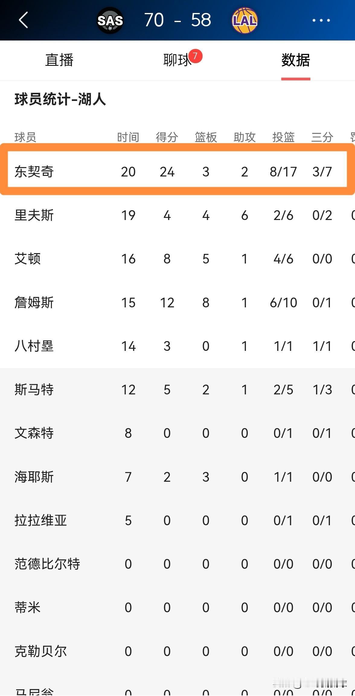 湖人当家球星东契奇不愧是当今联盟最强得分手之一!在今天湖人主场迎战马刺的上半场比赛中,东契奇首发出战20分钟,投篮17中8,其中三分球7中3、罚球8中5狂砍24分。 虽然湖人目前以58:70落后于对手结束了前两节的比赛,但是东契奇的表现简直是匪夷所思,得分对于东契奇来说就像喝凉水那样简单。
