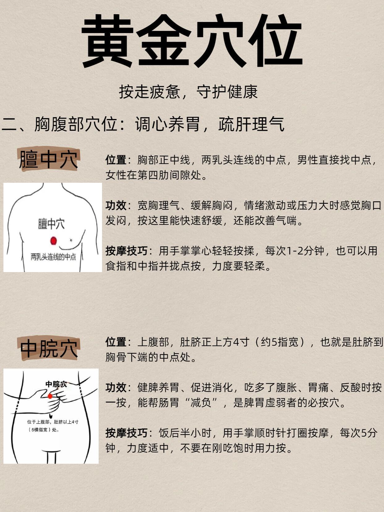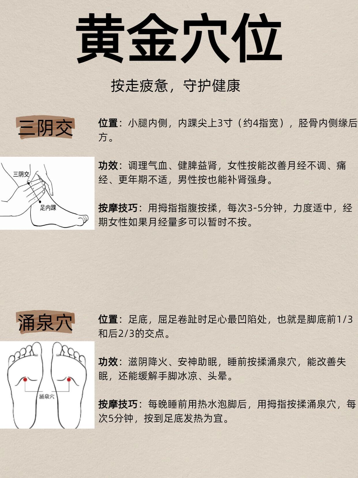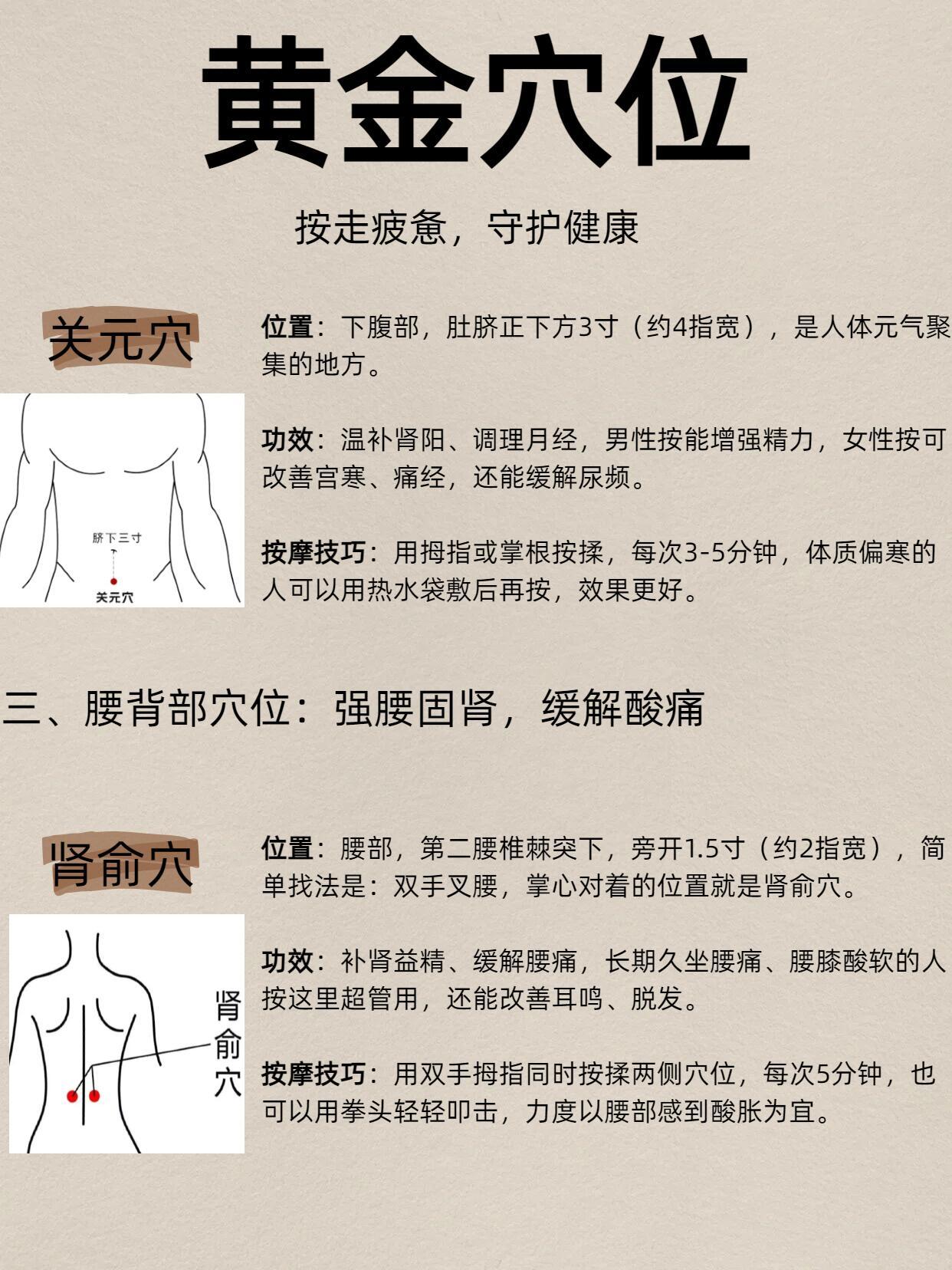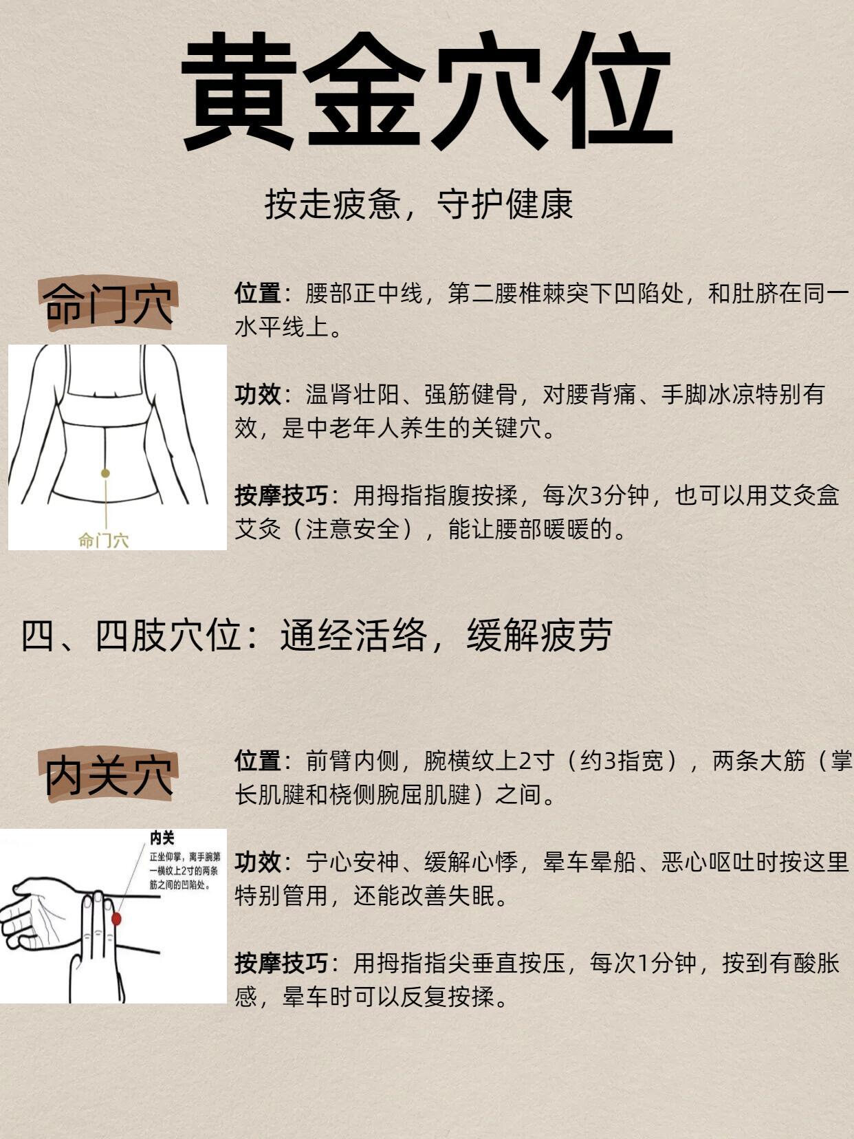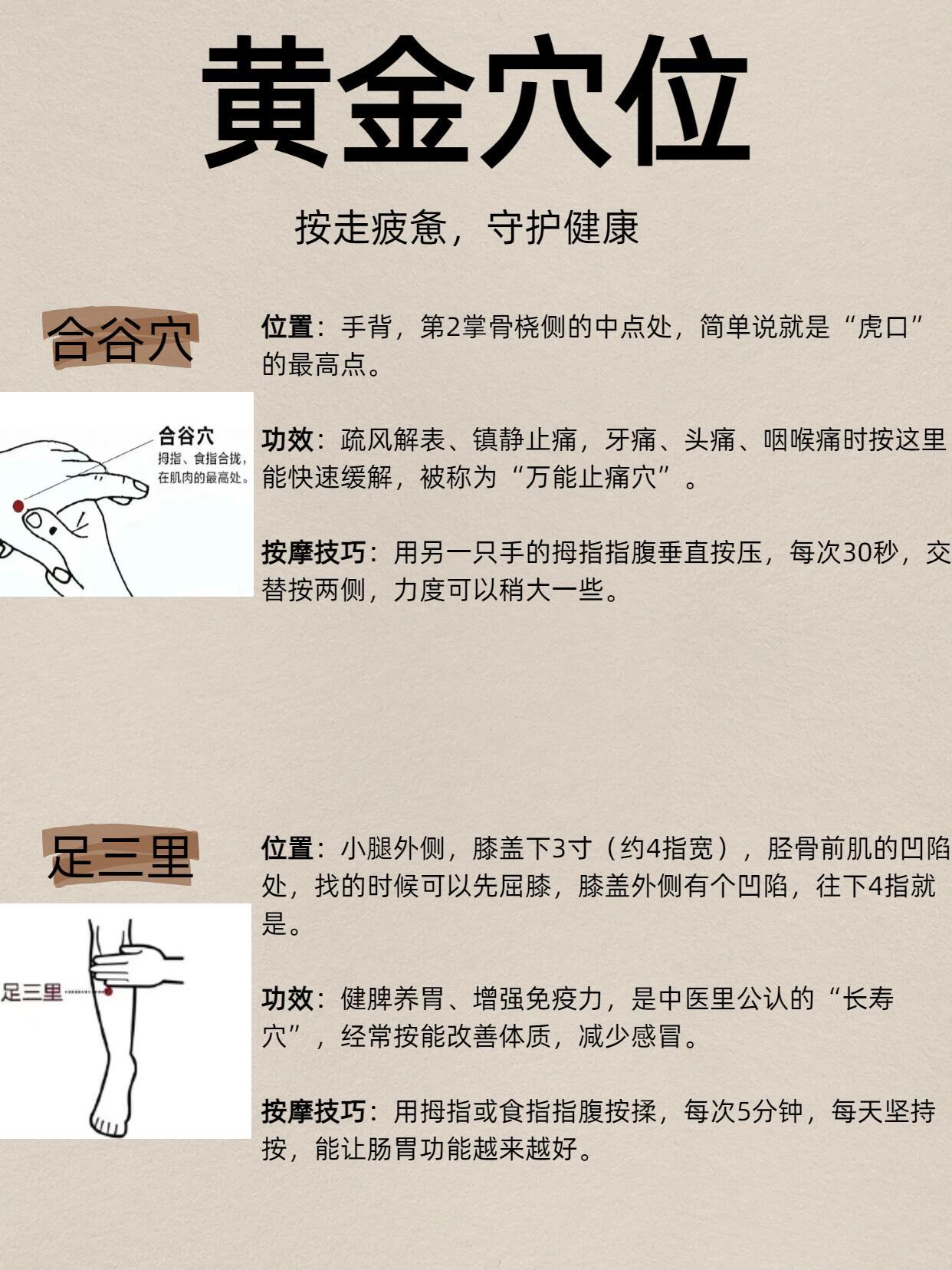 黄金穴位,你都知道吗?中医里常说“经络通,则百病消”,而穴位就是经络上的“能量开关”。不用花钱买保健品,随手按一按身上的这些“天然药库”,就能帮我们调理气血、缓解不适。今天就为大家整理12个日常养生必知的重要穴位,收藏起来慢慢按!【养生小贴士】1. 按摩穴位不用追求“越痛越好”,感到酸胀就是最佳力度,过度用力反而伤皮肤;2. 每次按摩时间3-5分钟即可,每天坚持比一次按很久更有效;3. 孕妇、高血压患者、皮肤有破损时,部分穴位需谨慎,最好咨询专业中医师;4. 穴位养生是日常调理,若身体有严重不适,一定要及时就医哦!穴位养生十二经脉循行经络
