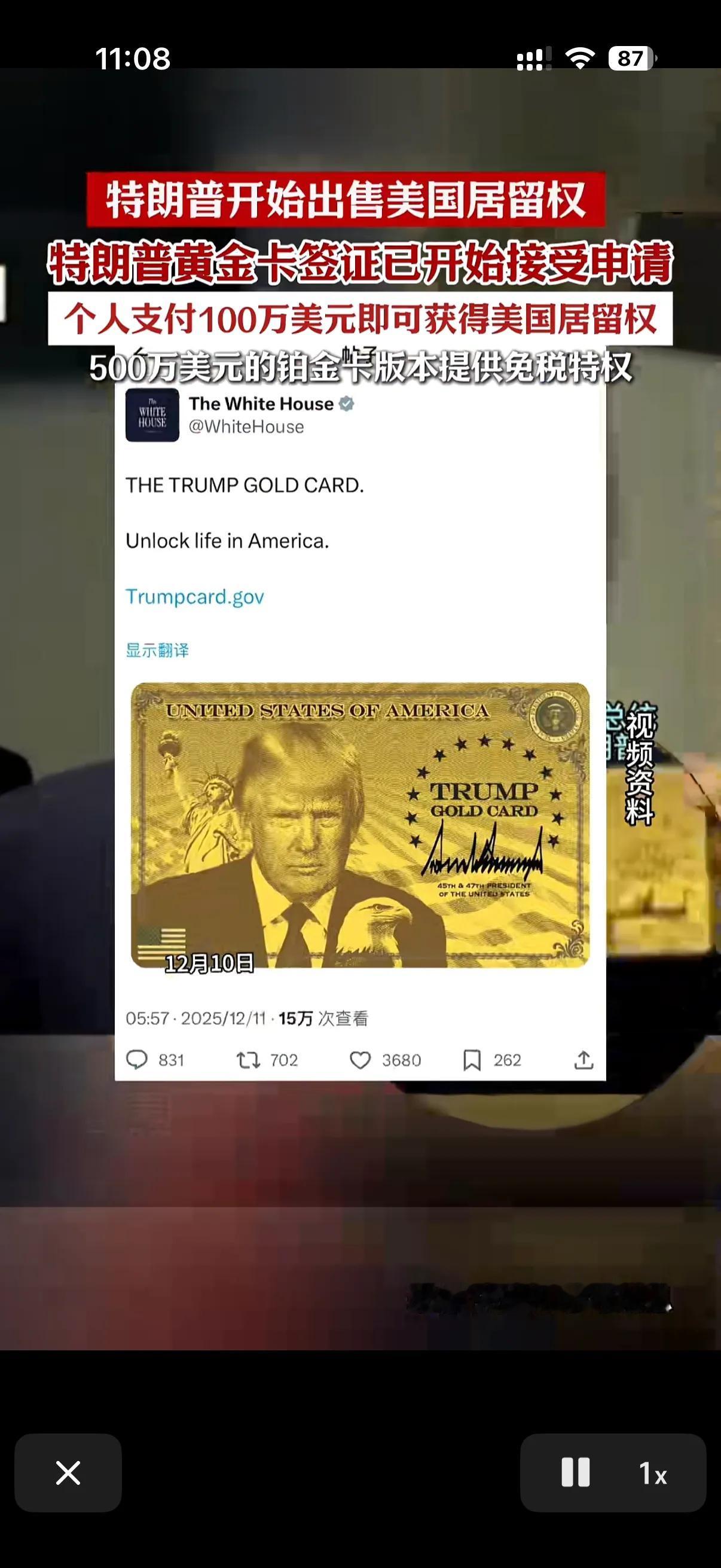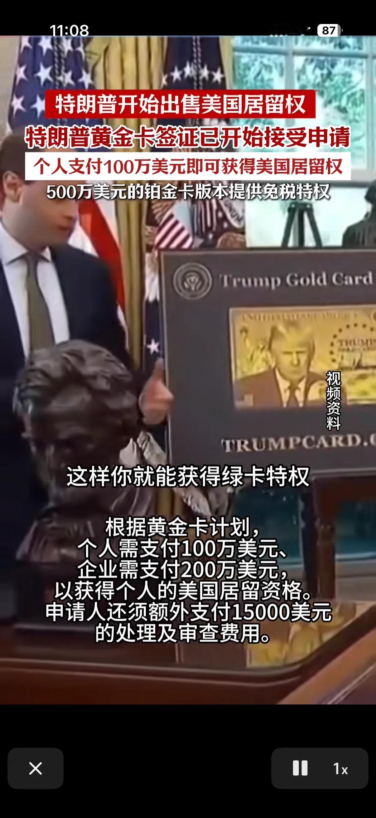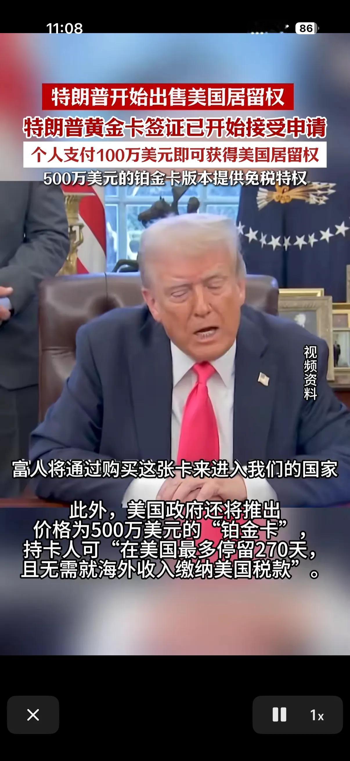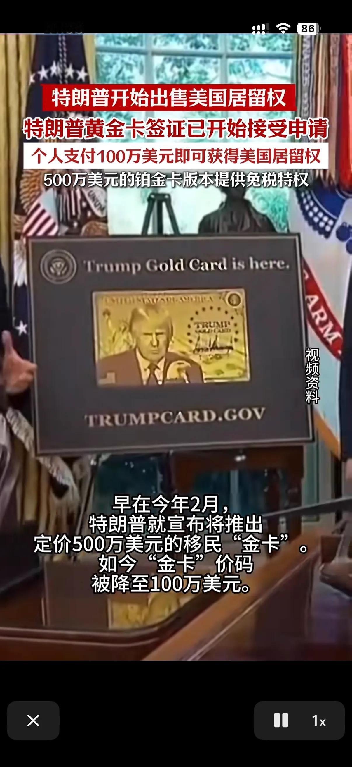 特朗普的金卡终于药开始售卖了! 最近美国的移民政策开始收紧,不少早期跑到美国的人都开始担心自己哪天早上起来就被移民局的人抓住遣返! 但是现在只要你有钱就不用担心了,只要你有一百万美金就可以购买特朗普的金卡,就可以移民美国了! 有效期多久不详!大概率是特朗普离任就失效了! 但是依然有很多人排队预订这张金卡! 而且还有svip级别的金卡就是最高500万的金卡,可以免税! 总之特朗普把销售会员卡那一套拿来卖自己移民金卡,现在看效果很好!