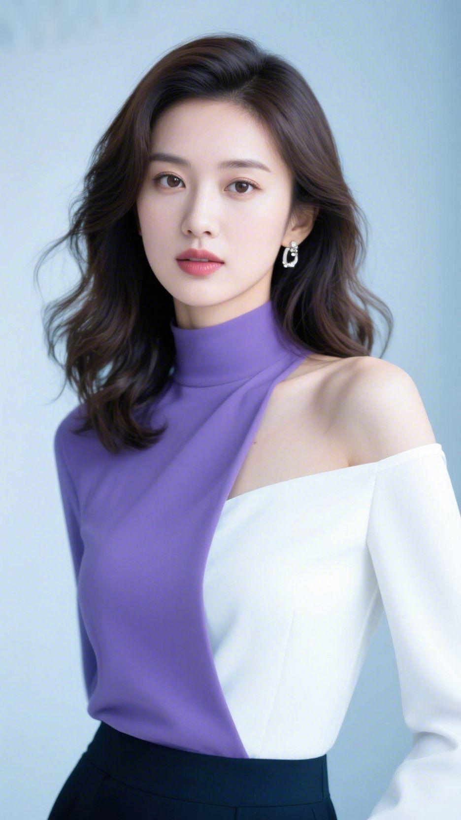 《紫柔》 淡紫与素白在肩颈轻叠,像拢住了春晨的雾与云。高领裹着妥帖的温,露肩的弧度漾着舒展——灵秀从不是失了端庄,紫白相衬的衣料,恰如日常里精巧的平衡:午后轻晃的帘,杯沿漫开的香,是柔缓裹住了鲜活,也是清爽藏在了温软里。 她抬眼时发梢轻扬,眼底盛着浅淡的光。不必说浓烈,不必说寡淡,这一身配色便把“舒展”穿成了模样:耳饰轻摇是细碎的悦,卷发微垂是恰好的柔,连气息里都浸着不慌的雅。好看从不是刻意的妆,是雾裹云那样,轻软,却让人移不开眼。 撞色穿搭 气质通勤