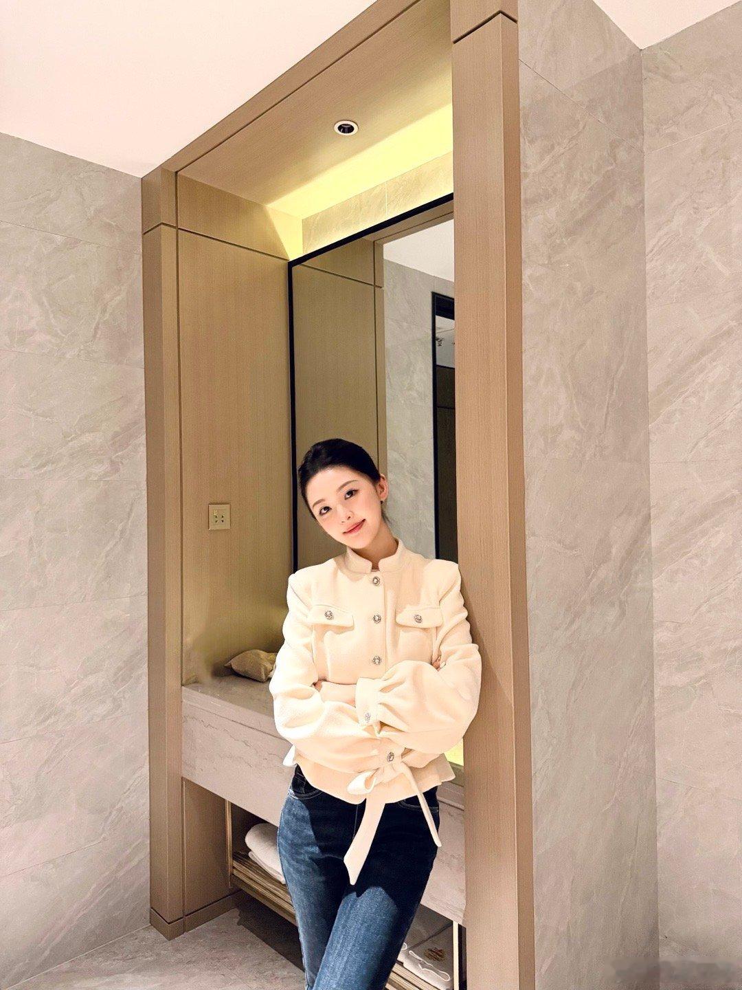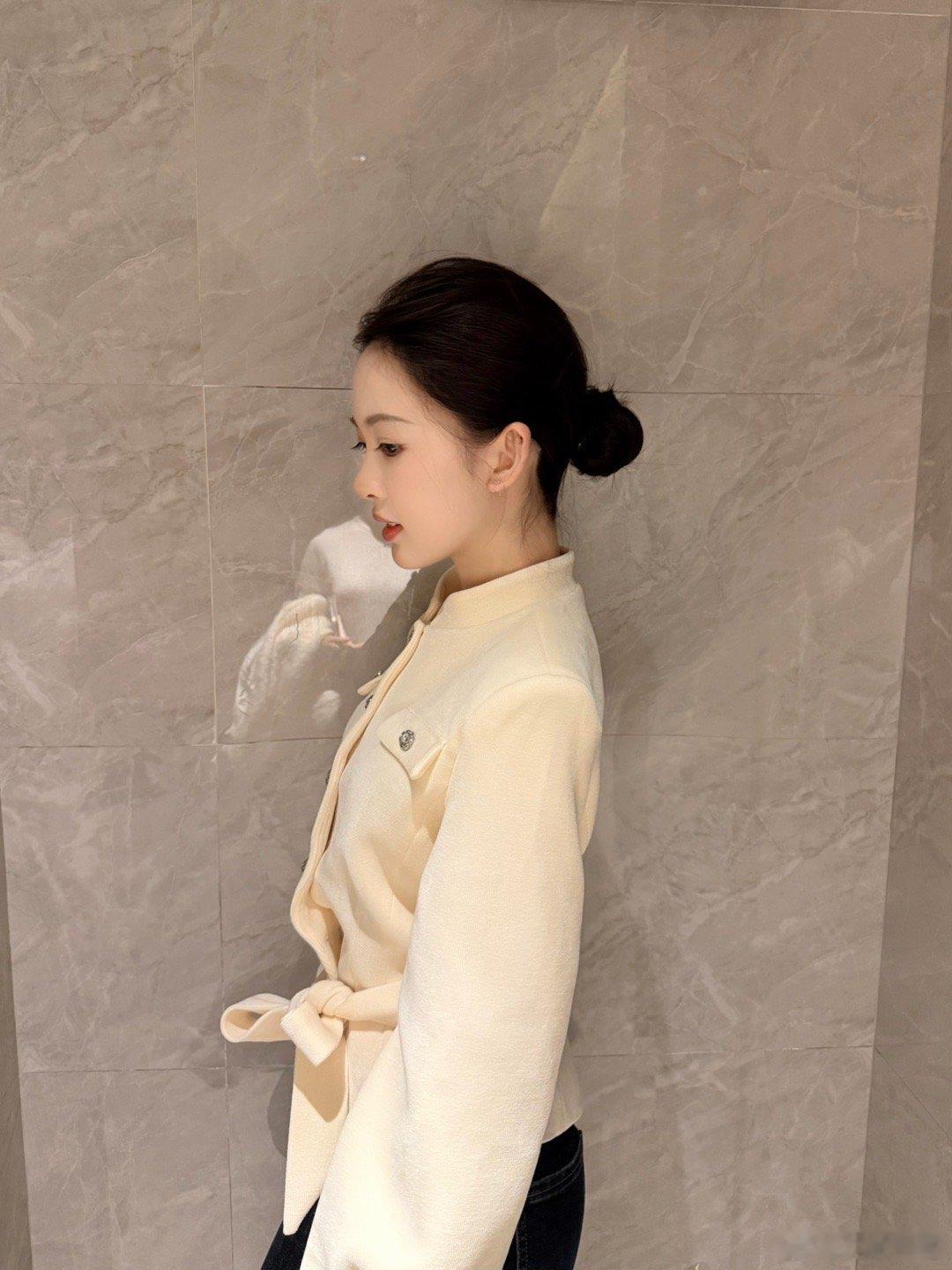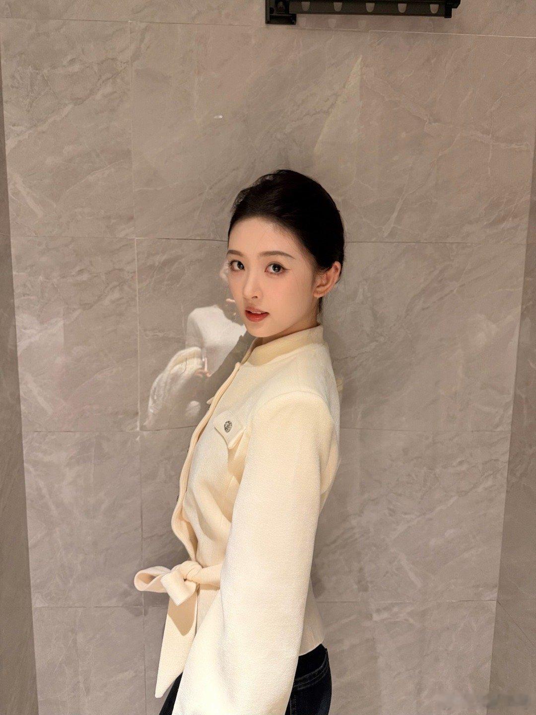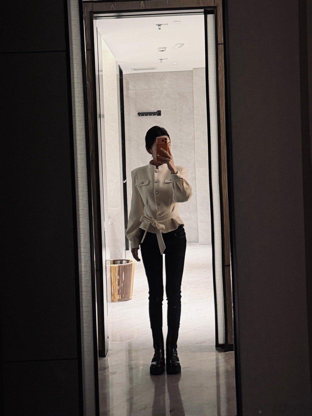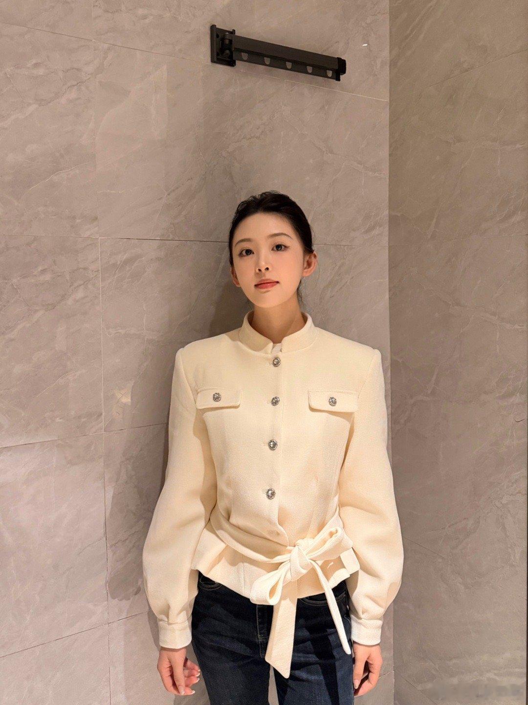 12月10日,又见佩通坦!竖条纹蓝色衬衣,白色阔腿裤,白色高跟鞋,一如既往的马尾