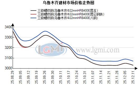 根据兰格钢铁云商平台监测数据显示,以乌鲁木齐为例,截至2025年12月11日,乌鲁木齐建材市场HRB400EΦ22mm螺纹钢八钢3070元,昆仑钢铁3030元,昆玉3030元,闽新3030元,大安3020元,新安特3020元,和钢3030元,较上个交易日持稳;HB300Φ8-10mm高线八钢3220元,较上个交易日持稳;HRB400EΦ8-10mm三级盘螺八钢3270元,较上个交易日持稳。
