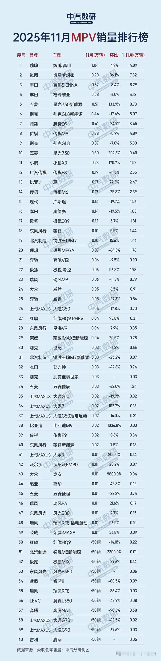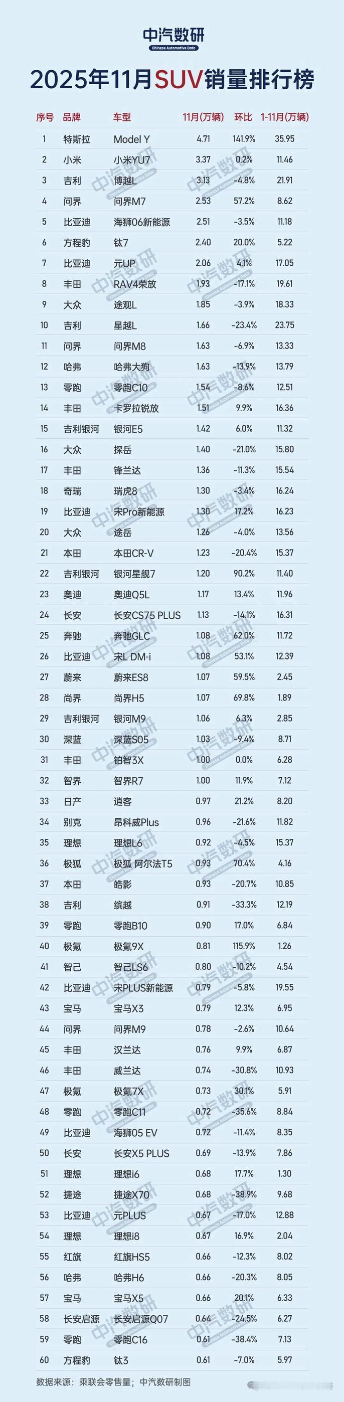 2025年11月轿车、SUV、MPV销量榜TOP60来了,可以参考一下。【来自懂