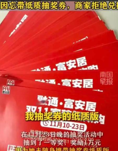 “玩不起别玩!”广西南宁,女子在建材市场买了13万的家具,商家送她50多张抽奖券,没想到,女子在抽奖环节抽中一等奖1万块,就在她兴冲冲准备领奖时,主持人忽然话锋一转,说中奖者必须在1分钟内持纸质抽奖券正券上台应号,女子心里一咯噔,没人告诉她必须拿抽奖券兑奖,所以她出门压根没带,不过她拍照留存了,于是,女子出示了奖券照片、身份证和销售单,然而她还是遭到拒绝,和1万大奖失之交臂。 “我当时真的控制不住情绪,就觉得自己被当成傻子耍了。”接受记者采访时,李女士眼眶泛红,语气里仍带着愤懑和委屈。 “那天是周末,人特别多,主持人喊到我的号码时,我真的激动得手都在抖。” 李女士回忆起当天场景,依旧能感受到那瞬间的兴奋。 她告诉记者,购买家具后商家送了她五十多张抽奖券。她怕放乱了,只拍照留底,把纸质券放在车里。“没人告诉我要随身带着,更没人说领奖要在一分钟内拿到台上。” 抽奖时,她听到主持人喊出自己的号码,立刻举手大叫:“是我!我中奖了!” 周围顾客也帮她起哄,“快点上去领奖!” 然而,当她刚跑到舞台前,主持人突然声音一冷:“请中奖者在一分钟内持纸质抽奖券正券上台,否则视为弃权。” 话锋突变,让李女士愣住。 “我当时就觉得不对劲,那种感觉——像是突然被泼一盆冷水。” 她赶紧掏出手机,亮出抽奖券照片、身份证和销售单据,解释纸质券在车上,可以立刻去拿。 但工作人员却面无表情地重复一句话:“规则写得很清楚,中奖者必须在一分钟内携带纸质券。” 一分钟——已经过去。 大奖——已经“作废”。 现场音乐随即响起,像是为了盖住她的声音。 “那一刻我站在台前,特别尴尬。” 李女士说,她不是不能接受规则,而是从头到尾没有任何人告诉她这个规则。 “我买了十三万的家具,你们连提醒一句都不愿意说?就等我犯错是不是?” 接到李女士求助后,记者来到事发建材城。 记者注意到,在主舞台四周,并没有醒目的“领奖需持纸质券”“需在一分钟内上台”等告示。舞台后侧的促销海报上,只写着“消费即送抽奖券”“大奖等你拿”等泛泛描述。 商家工作人员面对镜头态度明显谨慎:“活动规则都有提前告知。” 但当记者要求查看“提前告知凭证”时,他们却支支吾吾。 记者向销售人员询问是否在销售时说明领奖要求,一位导购犹豫片刻,说:“我们是提醒顾客要留好抽奖券的……但具体内容……可能没有讲那么清楚。” 而另一位工作人员干脆表示:“主持人在抽奖前有说过时间限制。” 但记者调取消费者现场拍摄的视频发现,在开奖前主持人只简单说了:“请中奖者尽快上台。”并无“纸质券必须在一分钟内到场”的字样。 规则是否被故意弱化?是否存在临时加条款?记者继续联系活动组织方,但对方以“领导不在”为由拒绝接受进一步采访。 李女士讽刺地说:“中奖的时候很热情,拒绝的时候一个个都像关机了一样。” 采访过程中,李女士多次提到一句话: “我不是非要这1万块,而是太憋屈了。” 她告诉记者,自己从事文职工作多年,性格温和,本不愿闹事。但这次商家的态度让她无法忍受。 “你知道那种感觉吗?你明明中奖了,明明可以证明那张券是你的,却被当着那么多人说‘无效’,像是你在撒谎。” “我上台的时候,周围好多目光都在看我。我真的是又气又恨又委屈。” 她的丈夫在旁边补充:“如果规则提前说,我们绝不会把券放车里。问题是他们根本不说,就是等着顾客忽略,然后说‘对不起,过期了’。” 李女士说,这一万元对家庭肯定有帮助,但真正让她决定维权的,是商家态度里那种“我就是不想给你,你能怎样”的傲慢。 事件曝光后,当地市场监管部门表示已受理投诉,将对活动规则是否公开、公正、合理展开调查。 事件登上热搜后,评论区几乎一片倒向李女士: “这类建材市场套路太多,不想给大奖就别搞活动。” “一分钟?你是在开玩笑吗?” “照片不能证明?那你们抽奖还要顾客带着几十张纸化身袋鼠?” “典型的设门槛式拒领奖。” 也有网友晒出自己遇到的类似经历:“中大奖永远是‘没人领’,终于明白为什么了。”