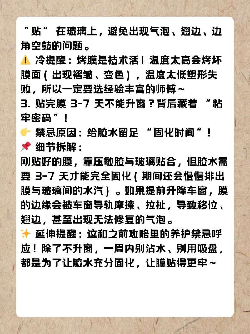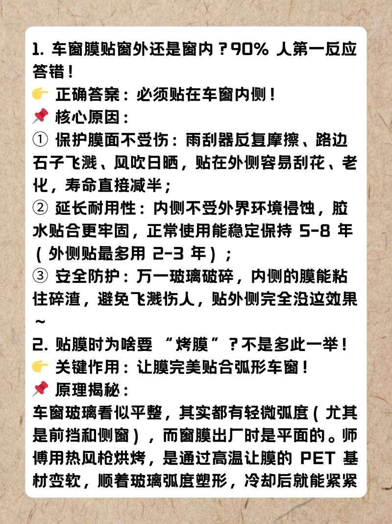 【90% 车主都踩过!车窗膜的 3 个冷知识,贴错亏大了】 贴车窗膜总犯懵?这 3 个冷知识,帮你避掉 90% 的坑👇 1. 车窗膜贴窗外还是窗内?90% 人答错! ✅ 正确答案:必须贴内侧!核心原因: 保护膜面:外侧易被雨刮、石子刮花,寿命直接减半; 延长耐用性:内侧不受环境侵蚀,胶层贴合更牢,能用 5-8 年(外侧最多 2-3 年); 安全防护:玻璃碎了,内侧膜能粘住碎渣,外侧完全没这效果。 2. 贴膜为啥要 “烤膜”?不是多此一举! ✅ 作用:让膜完美贴合弧形车窗!原理:车窗有轻微弧度,而膜是平面的。师傅用热风枪烤膜,让 PET 基材变软,顺着弧度塑形,冷却后就能贴紧,避免气泡、翘边。⚠️ 冷提醒:烤膜是技术活!温度太高会烤坏膜,太低塑形失败,一定要选经验足的师傅。 3. 贴完膜 3-7 天不能升窗?藏着 “粘牢密码”! ✅ 禁忌原因:给胶层留足固化时间!刚贴的膜靠压敏胶贴合,但胶层需要 3-7 天才能完全固化(期间排出水汽)。提前升窗,膜边缘会被导轨摩擦拉扯,导致移位、翘边、气泡。延伸提醒:一周内别沾水、别用吸盘,都是为了让胶层充分固化~【来自懂车帝车友圈】