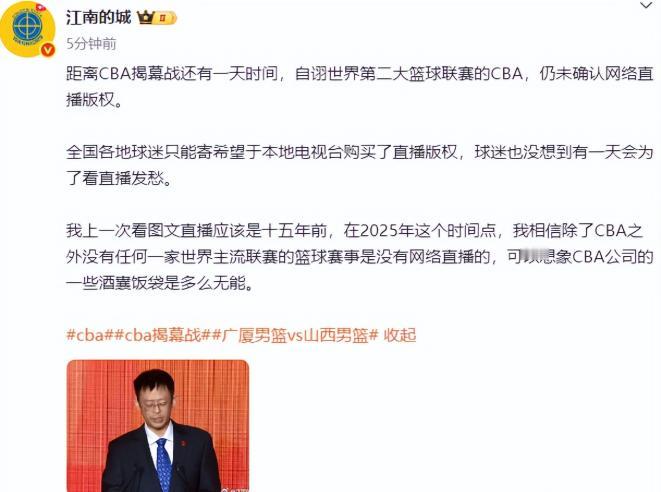 CBA 新赛季彻底凉了?无网络直播只剩图文 + 地方台,转播费漫天要价遭全网痛批 中国篮球迷集体破防!CBA 新赛季 12 月 12 日就要拉开大幕,却传来致命噩耗:腾讯早已退出转播,上赛季独家转播商咪咕也因 “转播费过高” 谈判破裂官宣退出,如今仅央视确定转播揭幕战广厦 vs 山西,且重大赛事时还会弃播 CBA,球迷想看球只剩地方台和图文直播,网友怒喷:“2025 年了,居然还在看十五年前的图文直播!” 这场转播危机全因 “漫天要价”!CBA 联赛无视自身市场价值,向转播商索要天价版权费,却忘了 NBA 能让腾讯、咪咕砸数亿抢购,靠的是全球顶级影响力和高关注度。而 CBA 既没有同级别的流量,还因中国男篮近期惨败韩国、亚洲杯仅获亚军的低迷表现,影响力持续下滑,转播商根本赚不到钱,自然不愿为虚高版权买单,咪咕的退出正是无奈之下的理性选择。 球迷观赛渠道窄到离谱!新赛季想追 CBA 只剩两条路:一是看地方台转播 —— 广东体育仅覆盖本省三支球队,其他地区大多无专属转播;二是看图文直播 —— 这种 “文字 + 静态图片” 的观赛模式,让网友感慨 “梦回高中,没想到 2025 年还得靠脑补看球”。更扎心的是,现在年轻人大多没有电视,图文直播成了多数人的唯一选择,与世界主流联赛的转播水平差距悬殊。 媒体人怒撕 CBA 管理层!知名媒体人直接痛批:“上一次看图文直播还是十五年前,除了 CBA,没有任何世界主流篮球联赛没有网络直播,这群酒囊饭袋太无能了!” 这番话戳中要害:CBA20 支球队中,仅广东、辽宁等少数强队有高关注度,多数倒数球队无人问津,市场价值本就有限,还盲目抬高转播费,无异于自掘坟墓。 闭门造车终将被市场抛弃!CBA 管理层无视联赛现状,一边是男篮成绩拉胯导致关注度下滑,一边是不顾转播商盈利逻辑漫天要价,最终陷入 “无网络直播” 的尴尬境地。网友刷屏吐槽:“没有转播就没有曝光,没有曝光更没人看,这是恶性循环”“CBA 根本不在乎球迷,只想着圈钱”“连球都看不了,谁还关注新赛季”。 从咪咕退出到只剩图文直播,CBA 新赛季还没开打就注定凉凉?你觉得 CBA 该降价求转播,还是继续硬扛?评论区聊聊~