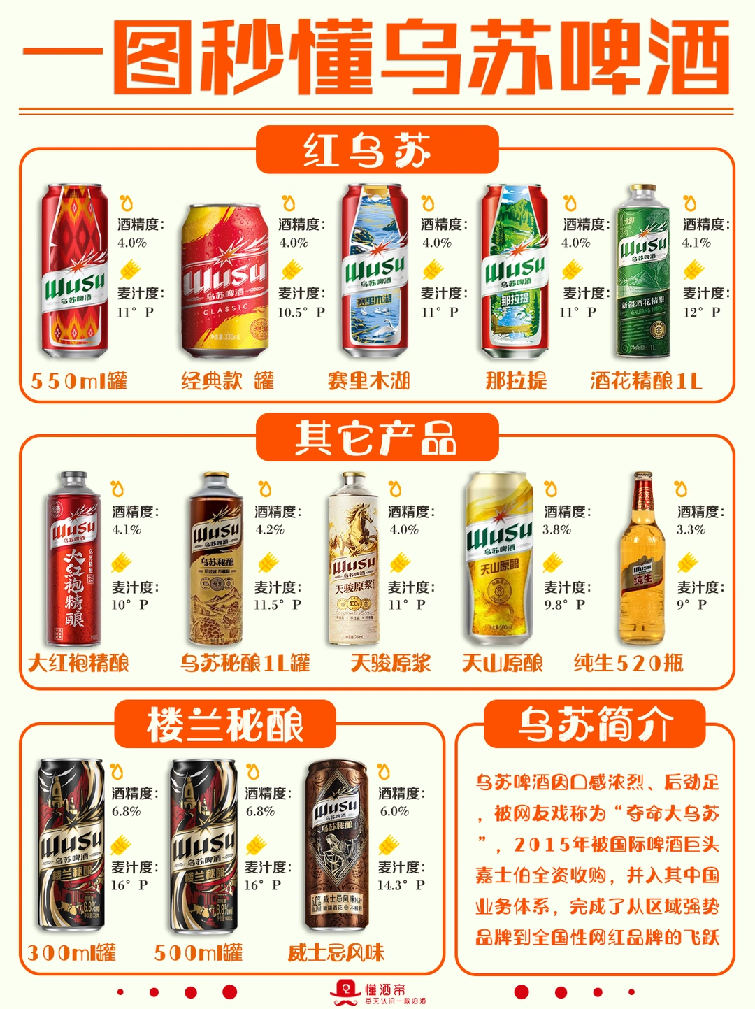 · 今天给大家盘一下👀: 一图秒懂啤酒系列[清单R]之「乌苏啤酒」🍺 它是江湖大名鼎鼎的“夺M大乌苏”👻 2016年被嘉士伯集收购✔️完成到全国的飞跃🛫 它还是你的标配烧烤搭档么🍻? 一起看看👀乌苏啤酒都有哪些产品~ · 1️⃣红乌苏🍺 ✅️乌苏啤酒的标志性产品,被誉为“国民硬核口粮”,以其饱满的酒体与醇厚风味,成为好友欢聚、夜市烧烤的经典搭档。 🍻主要产品:620ml瓶、500ml罐、300ml罐、1L罐、5L桶装、550ml罐、经典款330ml罐、赛里木湖、那拉提、复古瓶 2️⃣白啤系列🍺 ✅️乌苏白啤延续德式小麦啤酒工艺,散发淡淡果香与麦芽甜香,口感清新顺滑,适合追求细腻风味的人群。 🍻主要产品:小麦白啤500ml罐、小麦白465ml瓶老款、小麦白465ml瓶、天山白啤500ml罐、天山白啤330ml罐 3️⃣绿乌苏🍺 ✅️主打清爽顺滑的淡爽型拉格,酒精度与苦度较低,入口轻快易饮,适合轻松畅饮的日常场景。 🍻主要产品:620ml瓶、500ml罐、330ml罐 4️⃣黑啤系列🍺 ✅️乌苏黑啤融合烘焙麦芽的焦香与酒花甘醇,带有可可与咖啡的悠长余韵,适合偏爱浓郁层次与深邃风味的啤酒爱好者。 🍻主要产品:500ml罐、465ml瓶 5️⃣楼兰秘酿🍺 ✅️乌苏啤酒的高端产品线,以西域古国“楼兰”为灵感,注重酿造工艺与风味创新,展现品牌深厚的地域文化与匠心追求。 🍻主要产品:300ml罐、500ml罐、威士忌风味330ml罐 6️⃣其它系列🍺 🍻主要产品:大红袍精酿500ml罐、乌苏秘酿1L罐、天骏原浆750ml罐、纯生520瓶、天山原浆500ml罐 ·