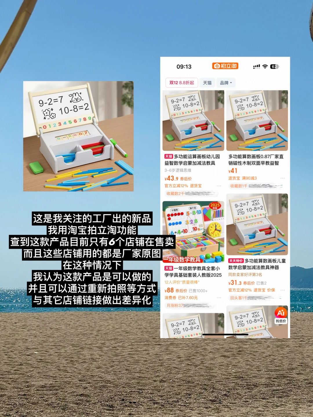 首先,在1688上找品,我们要确定一个原则,就是要选择竞争小的商品,如果一个商品你以图搜物在🍑上能翻出几十页的卖家,那这个品就不是我们的目标品,我现在拿货的话,搜出来如果市面上只有10家以内,而且这些店铺都没做出来什么销量,那我就会拿(具体见图2),
