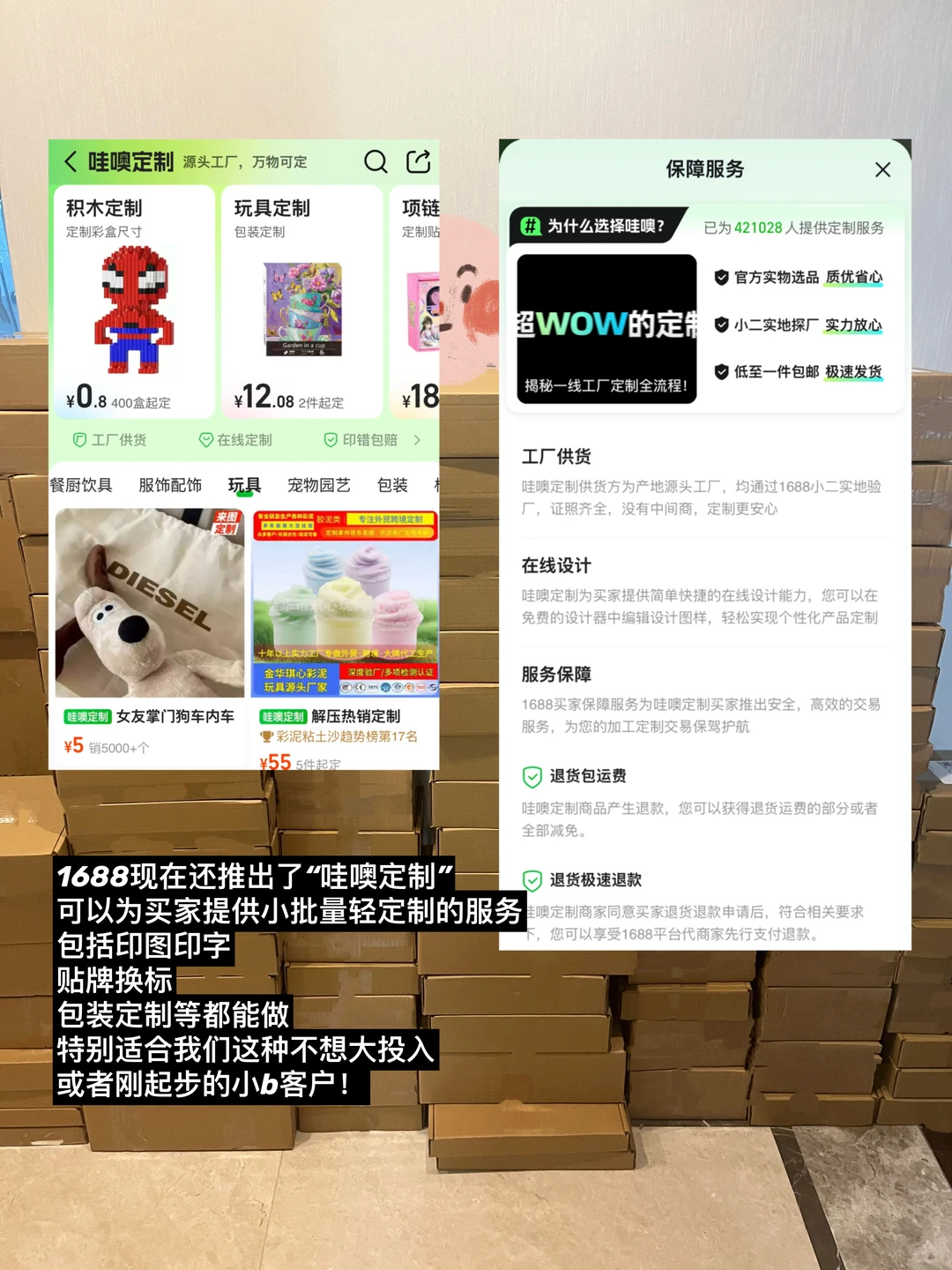 另外1688现在还推出了“哇噢定制”,可以为买家提供小批量轻定制的服务,包括印图印字、贴牌换标、包装定制等都能做,特别适合我们这种不想大投入或者刚起步的小b客户!定制结合跨境功能市场竞争力更强哦(见图9)