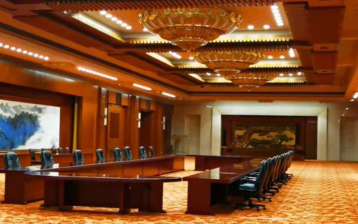 人民大会堂的这个厅室是不是看着眼熟,这是大会堂的东大厅,也是经常出现在新闻联播的电视画面里面。 经常看新闻联播的读者就晓得了,这地方经常举行新闻发布会。 这东大厅也是经常举办各种重大的外事活动。 东大厅的位置不偏僻,上了二楼就能看到,之所以被称之为东大厅,也是因为这个厅室坐落在大会堂的正东方。 这个厅室的面积还挺大的(1120平方米),整个厅室给人的感觉就是一个字“大”,两个字“宏伟”。 当时,在修建东大厅的时候,为彰显出这个厅室的宏伟,因此就在整体高度这个细节上做文章了。 最直观的一个数据:从天花板到地面的距离,就有差不多5米高了。 在东大厅的两边,分别是黑龙江厅、江西厅。 如果东大厅举行什么重大活动的时候,两侧的黑龙江厅和江西厅就是给人休息的厅室。