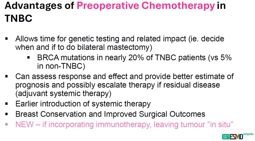 白大褂朋友已在线 🍊家人们,又来聊这个话题啦 三阴性乳腺癌还是人们最担心的类型 可以理解,毕竟相对更难对付 但近些年也摸索出一套行之有效的治疗方案 明显改变了三阴性乳腺癌的结局 其中,新辅助化疗(免疫治疗)功不可没 近期欧洲肿瘤学领域的专家做了一个总结 给诸位参考参考 …… ⛳1.为遗传检测赢得时间 BRCA 突变在 TNBC 中占≈20%(非 TNBC 仅5%),术前治疗窗口可从容完成基因检测,同步决定是否需要双侧切除 ⛳2.体内"实时药敏试验" 通过病理反应( pCR /残留)即时判断预后,并指导术后是否升级治疗(如卡培他滨、奥拉帕利、免疫) ⛳3.更早启动系统治疗 把可能存在的微转移灶"提前锁死",比术后辅助更早暴露于药物 ⛳4.提高保乳率与外科效果 降期缩瘤保乳机会↑、切缘更易阴性、腋窝 清扫范围缩小 ⛳5.免疫治疗时代的新论点 "原位留瘤"成为免疫激活优势:肿瘤抗原持续存在,可放大 PD -1/PD-L1抑制剂效应 🎗总结: TNBC 新辅助=遗传决策+实时药敏+提前灭微转+保乳降刀+免疫放大器,一举五得