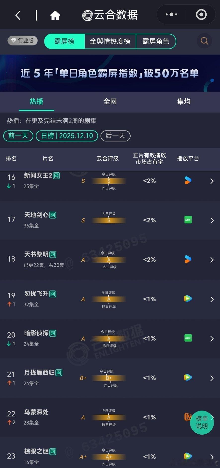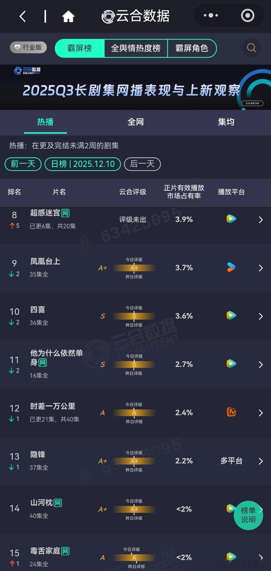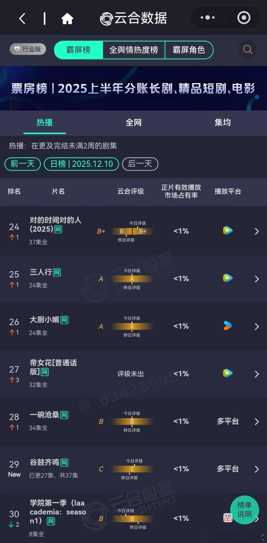12月10日云合播放占比云合 大生意人19.7%狙击蝴蝶11.2%评级S风与潮云