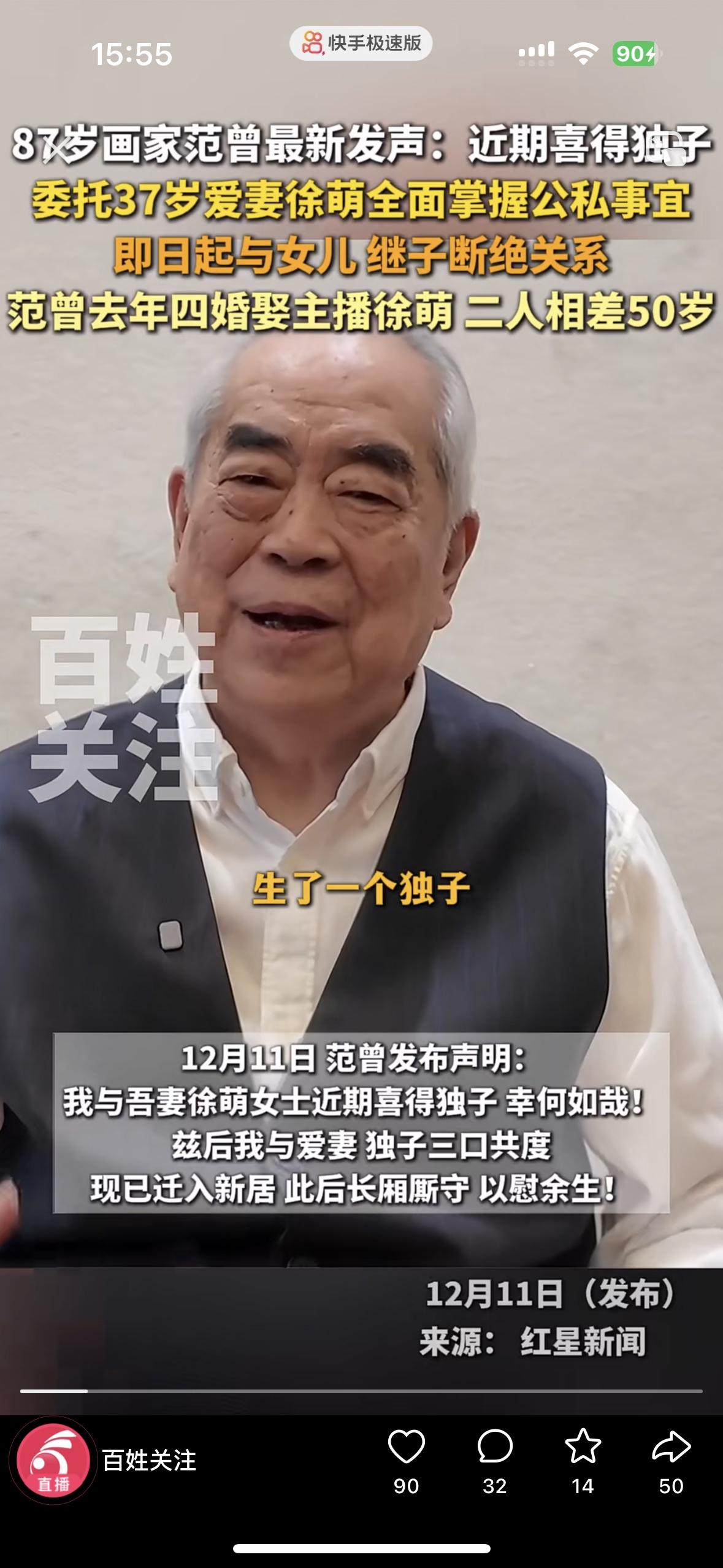 这样的人是怎么当上画家的!当爷爷的年纪又和自己的孙女差不多的老婆生了个儿子 画家范增娶了37岁的女主播徐萌,两个人相差50岁,又生了个儿子,宣布与女儿以及继子断绝关系! 搬了新家,是怕孩子们争夺财产吗?还把所有的事交给他的老婆处理!37岁第四任妻子真是好手段,把一个老头哄的团团转,人家亲生父女的关系都让她整的断绝来往了