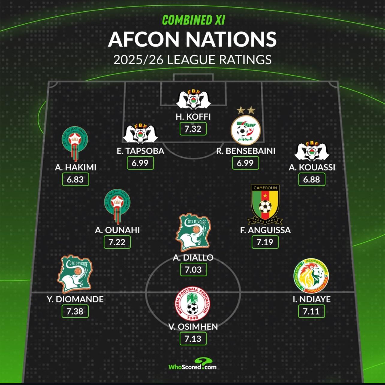 莱比锡前锋迪奥曼德以7.38分成为阵中评分最高的球员,奥斯梅恩则是当今非洲足坛的顶级中锋,中场安圭萨是喀麦隆的攻防核心,阿什拉夫则兼具摩洛哥后防稳定性与边路进攻威胁。