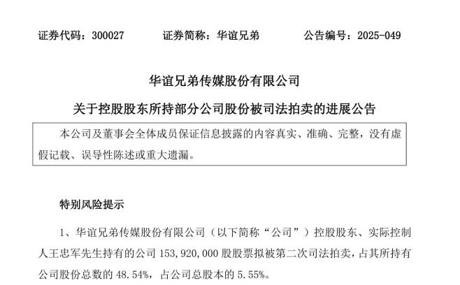 12月10日,华谊兄弟(300027.SZ)发布公告披露,截至当日公司在金融机构的逾期债务合计达5250万元,该金额已超过其2024年经审计净资产的10%,同时公司部分银行账户被冻结约人民币64万余元及少量美元。公告同时透露,公司正通过与金融机构协商续贷、处置非核心资产等方式化解危机。