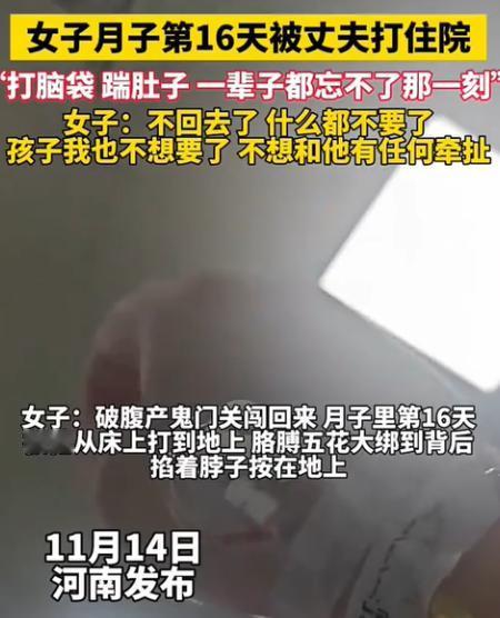 “太心寒了!”河南一女子剖腹产后刚16天,就被丈夫打脸踹肚子,直接住进了医院。出院后,她决绝表示:不回婆家,什么都不要,孩子也不要了,必须离婚。这哪是家?分明是修罗场。女人拿命生孩子,不是来挨打的! 太心寒了!”这是许多网友看到这起事件后的第一反应。一个刚经历剖腹产、身体与情绪都处在极度脆弱期的女人,本该被细心照料、被呵护、被鼓励。 没想到她等来的不是一句关心、一杯热水,也不是一个拥抱,而是一记巴掌、一脚狠踹。生产16天,她的伤口还没完全愈合,却因丈夫的暴力再次被送进医院。 事件被曝光后,评论区瞬间炸开了锅。有人震惊、有人愤怒、有人骂得直接,有人心疼到不知如何表达,只反复问:“这是什么男人?” “老婆为你怀胎十月、开肚剖人,你一句谢谢都没有,反而下狠手?这种人连做人的底线都没有。正常人看到妻子刚生产,走路慢点都心疼,他居然敢踹肚子?什么东西?” “产后抑郁本来就在高发期,再加上伤口疼、睡眠差、荷尔蒙失调,心理极脆弱。他还打?万一踹到刀口裂开,或者引发大出血,这不是闹着玩的,是可能要命的!这种行为已经不是‘脾气不好’,是赤裸裸的暴力犯罪。” “每一次生产都是在鬼门关走一遭。男人享受家庭、享受孩子,却不愿承担一点责任。 婚姻不是说说而已,是互相扶持,不是让女人当牲口一样被使唤、被殴打。” 她甚至说:“如果连基本尊重都做不到,那这婚离得越早越好。” 不少网友强烈支持女方的决定: “不要幻想暴力男能改,第一次动手就会有第二次。” “离婚是她的自救,也是给孩子一个远离暴力的未来。” “不要财产,不要孩子也不要他,这句话背后不知道经历了多少绝望。” 很多人指出,产后的女人很容易被“孩子要完整家”“忍忍就过去了”绑架,但真正的完整是安全,不是凑合。 这条评论被不断转发:“家暴是犯罪,不是‘夫妻吵架’。无论男女,遭到家暴都应该第一时间报警,保留证据。不要因为所谓的面子、情分而忍。每一次忍让,都是纵容下一次施暴。” 网友还讨论到是否应推动更严格的家暴法律、设立更多保护机制、提高公众意识等。一位律师网友说:“家暴没有灰色地带,只要动手,就是零容忍。” 也有人把矛头指向更深层的问题: “为什么有些男人觉得结婚后妻子就是自己的附属?为什么觉得女人生孩子是理所当然?为什么情绪上来就能打人?这是家庭教育缺失、性别意识落后、社会价值观失衡共同造成的。” 一位网友说得直白:“这种人不是一天变成这样的,他是从小到大都觉得‘男人打女人天经地义’,真正可怕的是,社会上还有不少人跟他一样。” “没有什么比生命更重要,婚姻不是女人的全部,被伤害了就要离开。” “生孩子不是一方的义务,也不是牺牲自己换来对方感恩的筹码。” “你值得更好的,而不是在刀口未愈合的身体上被拳脚相向。” 很多网友呼吁女性提升自我保护意识,包括经济独立、法律意识、底线意识等。