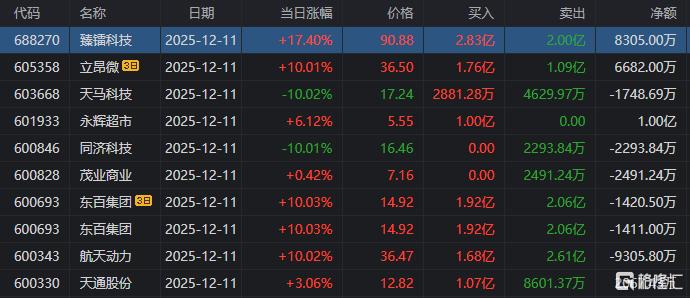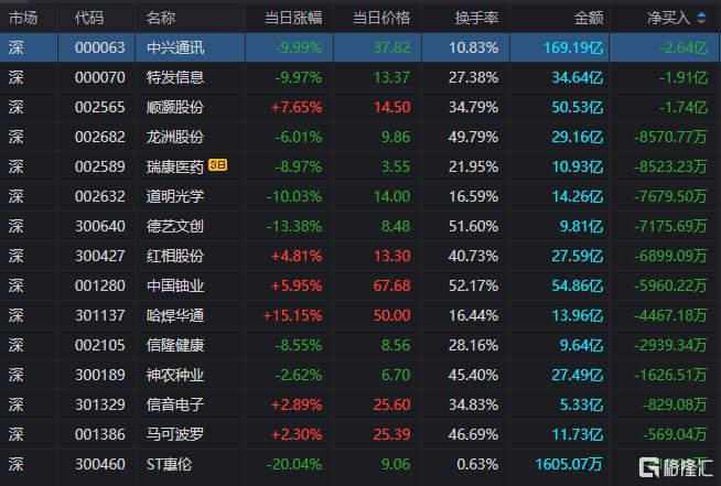龙虎榜单日净卖出额前三为中兴通讯、特发信息、顺灏股份,分别为2.64亿元、1.91亿元、1.74亿元。