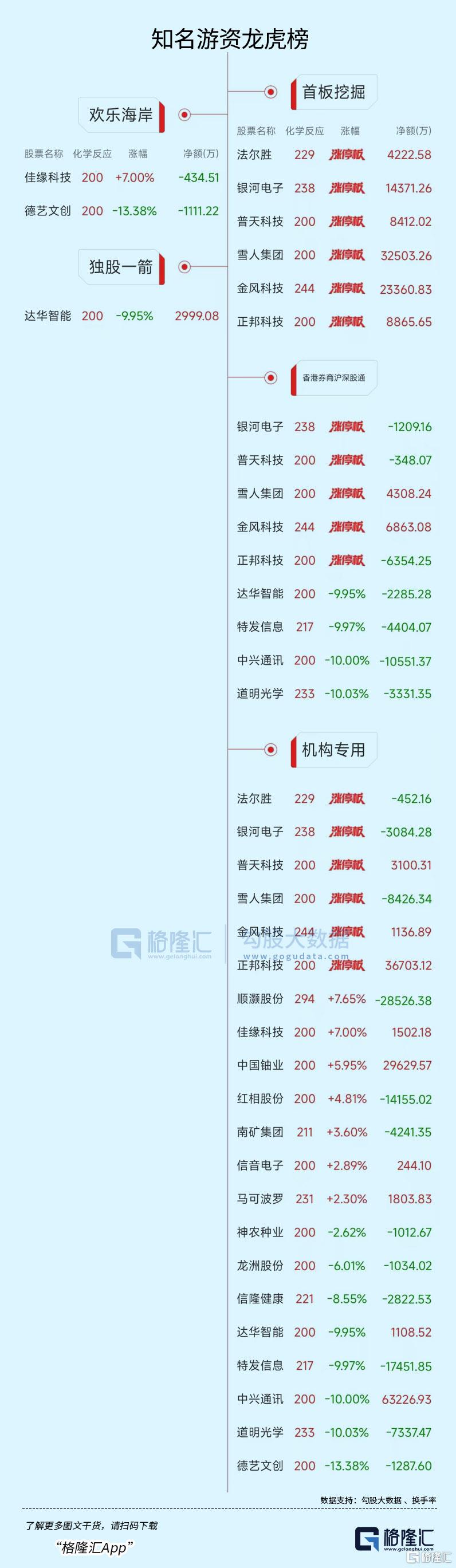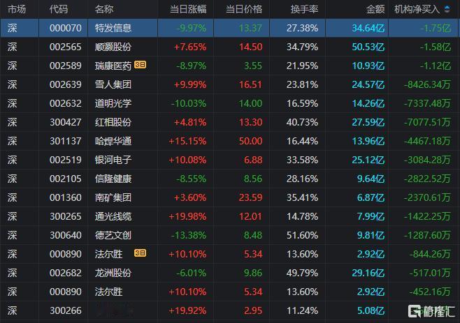 龙虎榜中涉及机构专用席位的个股中,单日净卖出额前三为特发信息、顺灏股份、雪人集团,分别为1.75亿元、1.58亿元、8426.34万元。