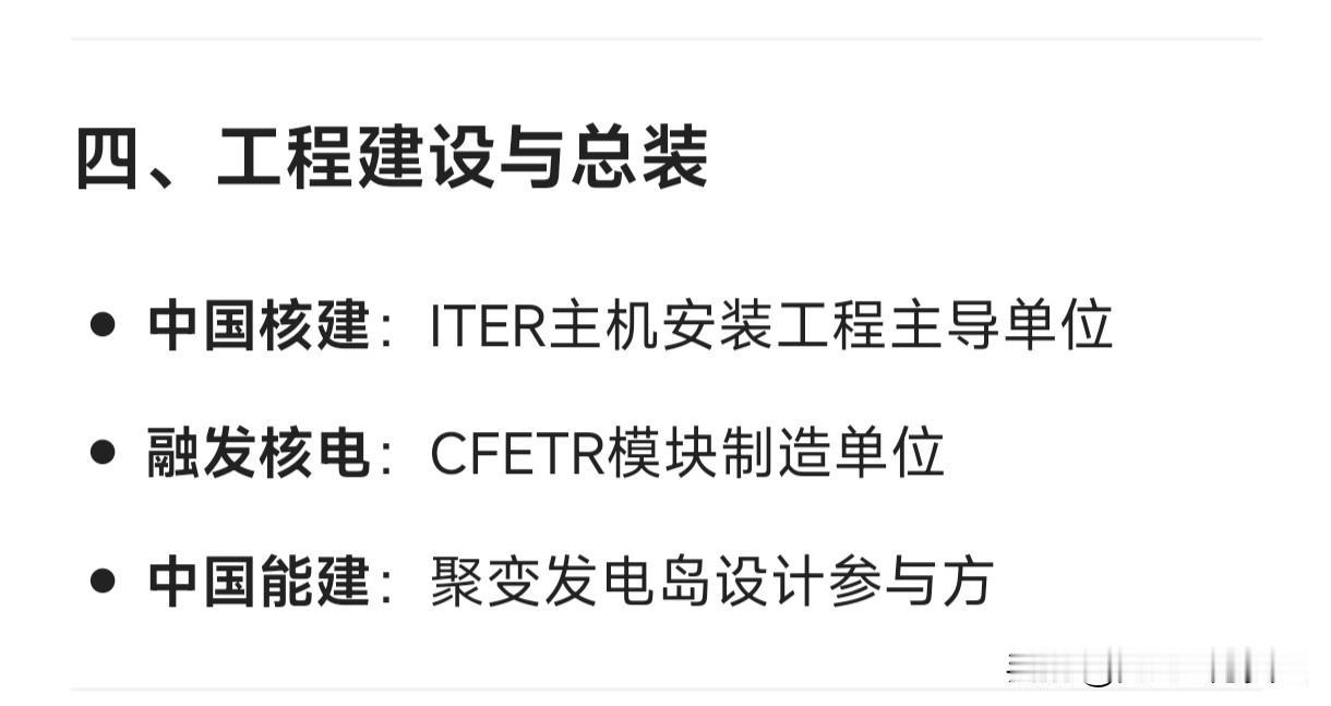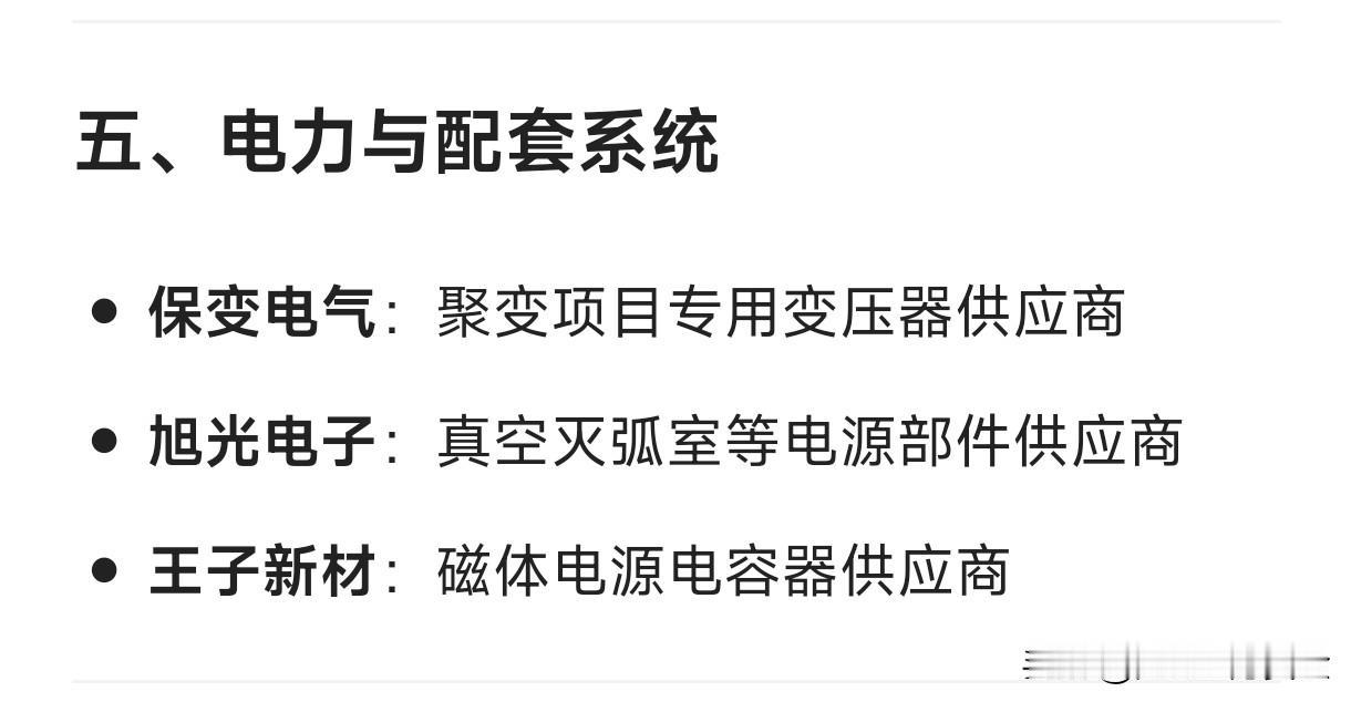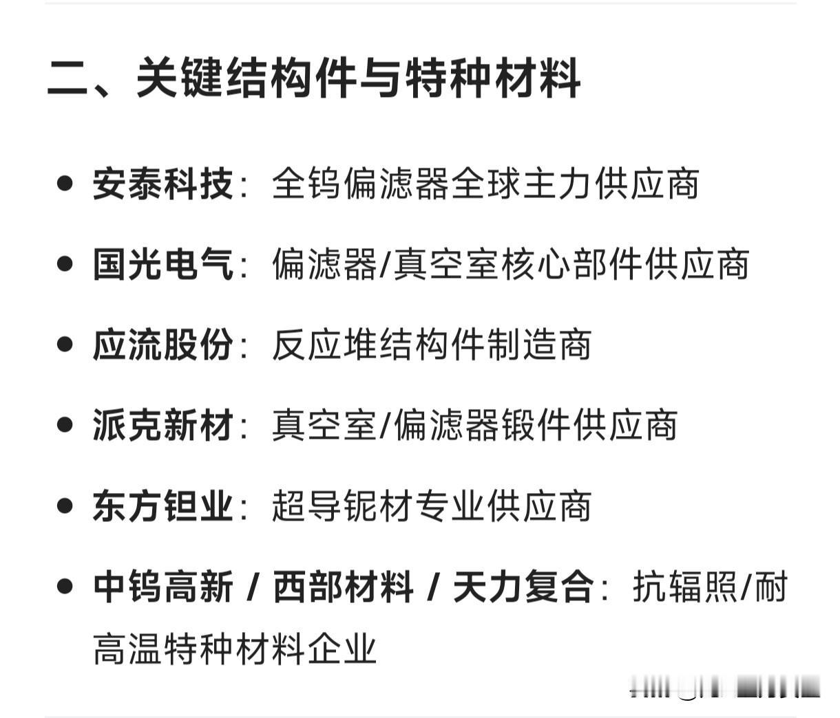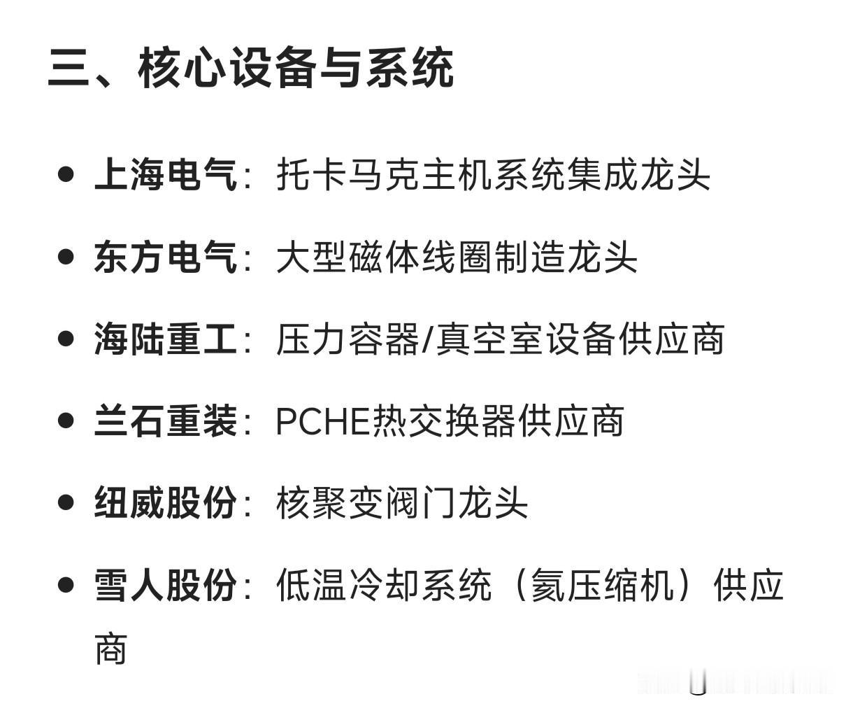 可控核聚变概念核心细分领域龙头: 一、超导材料与磁体系统 西部超导:超导线材(NbTi/Nb₃Sn)龙头 永鼎股份:高温超导带材供应商 联创光电:高温超导磁体研发企业   二、关键结构件与特种材料 安泰科技:全钨偏滤器全球主力供应商 国光电气:偏滤器/真空室核心部件供应商 应流股份:反应堆结构件制造商 派克新材:真空室/偏滤器锻件供应商 东方钽业:超导铌材专业供应商 中钨高新 / 西部材料 / 天力复合:抗辐照/耐高温特种材料企业   三、核心设备与系统 上海电气:托卡马克主机系统集成龙头 东方电气:大型磁体线圈制造龙头 海陆重工:压力容器/真空室设备供应商 兰石重装:PCHE热交换器供应商 纽威股份:核聚变阀门龙头 雪人股份:低温冷却系统(氦压缩机)供应商   四、工程建设与总装 中国核建:ITER主机安装工程主导单位 融发核电:CFETR模块制造单位 中国能建:聚变发电岛设计参与方   五、电力与配套系统 保变电气:聚变项目专用变压器供应商 旭光电子:真空灭弧室等电源部件供应商 王子新材:磁体电源电容器供应商