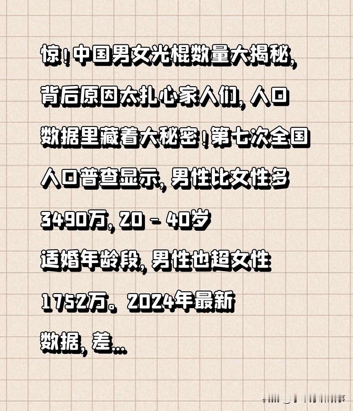 惊!中国男女光棍数量大揭秘,背后原因令人唏嘘 家人们,人口数据暗藏玄机!第七次全国人口普查表明,男性比女性多3490万,20 - 40岁适婚年龄段,男性超女性1752万。2024年最新数据显示,差距仍有2990万,适婚比例达129比100! 更令人感慨的是,农村男光棍聚集,源于男女比例失衡、娶妻成本高;城市女光棍也颇多,她们独立有追求,不愿凑合。这“一多一少”背后,是社会观念、经济等多因素交织。你身边有此现象吗?