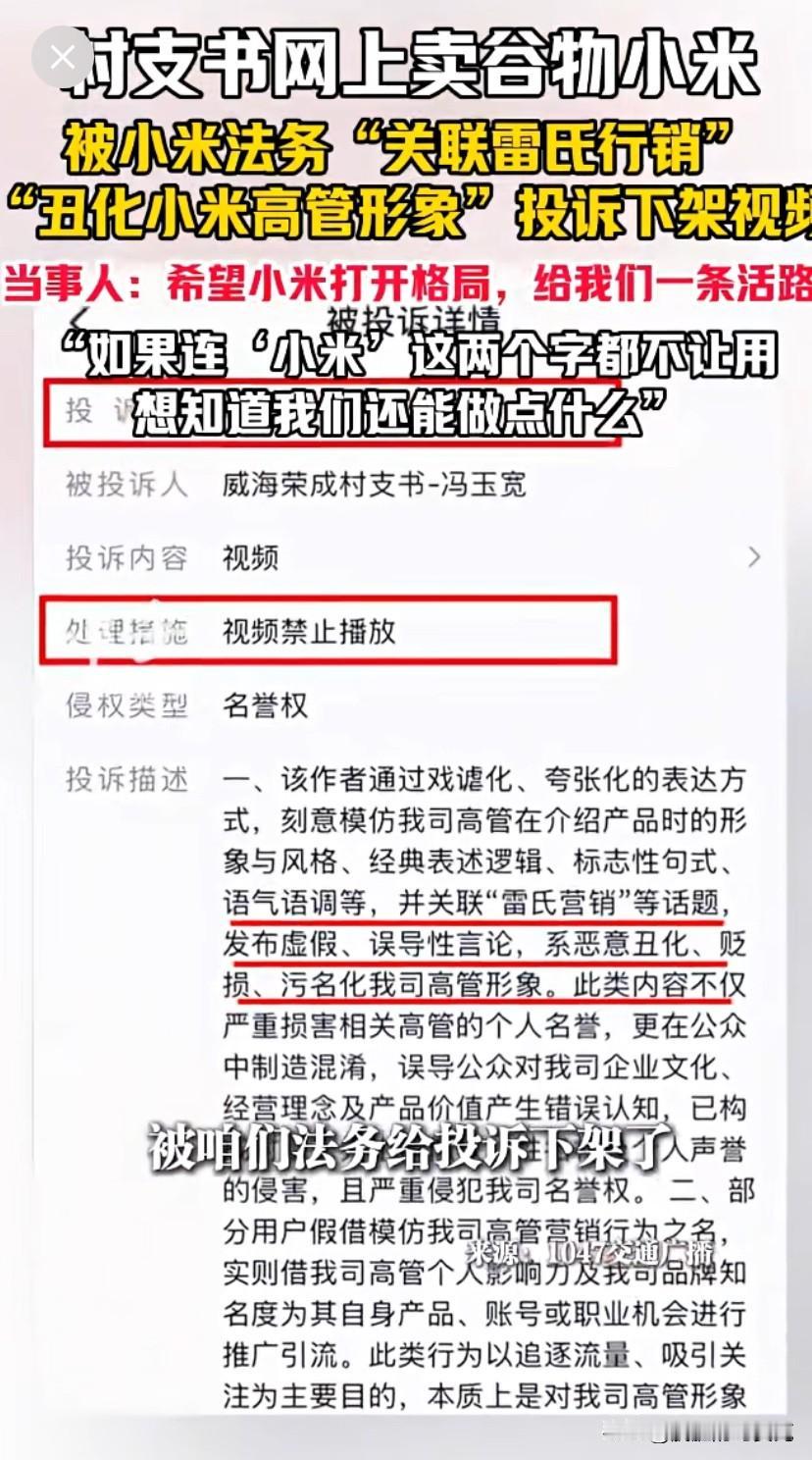 山东威海一村支书网上卖谷物小米,被小米法务“关联雷氏行销”“丑化小米高管形象”投诉下架视频。 我好担心,以后说煮小米吃以后会不会被小米起诉啊![呲牙][呲牙]建议以后把小米从我们的字典里里去掉,这样以后老百姓就少收到官司了。哎,这就是资本做大了的后果,大的可以影响老百姓的生活了。 兄弟作为小米手机第一代米粉,我代表自己给您道歉,并呼吁各大商标注册请勿占用老百姓的日常产品名称。