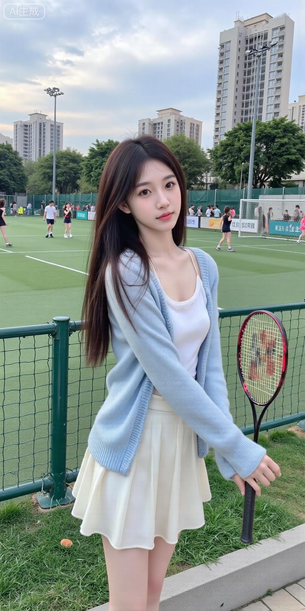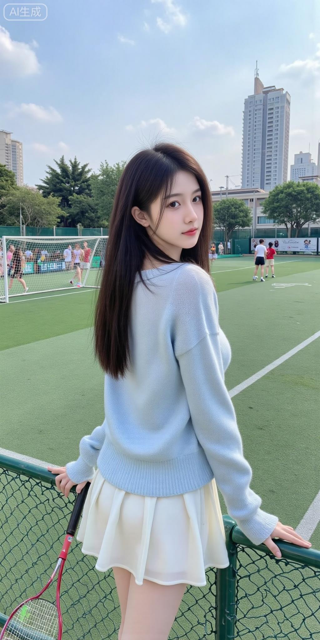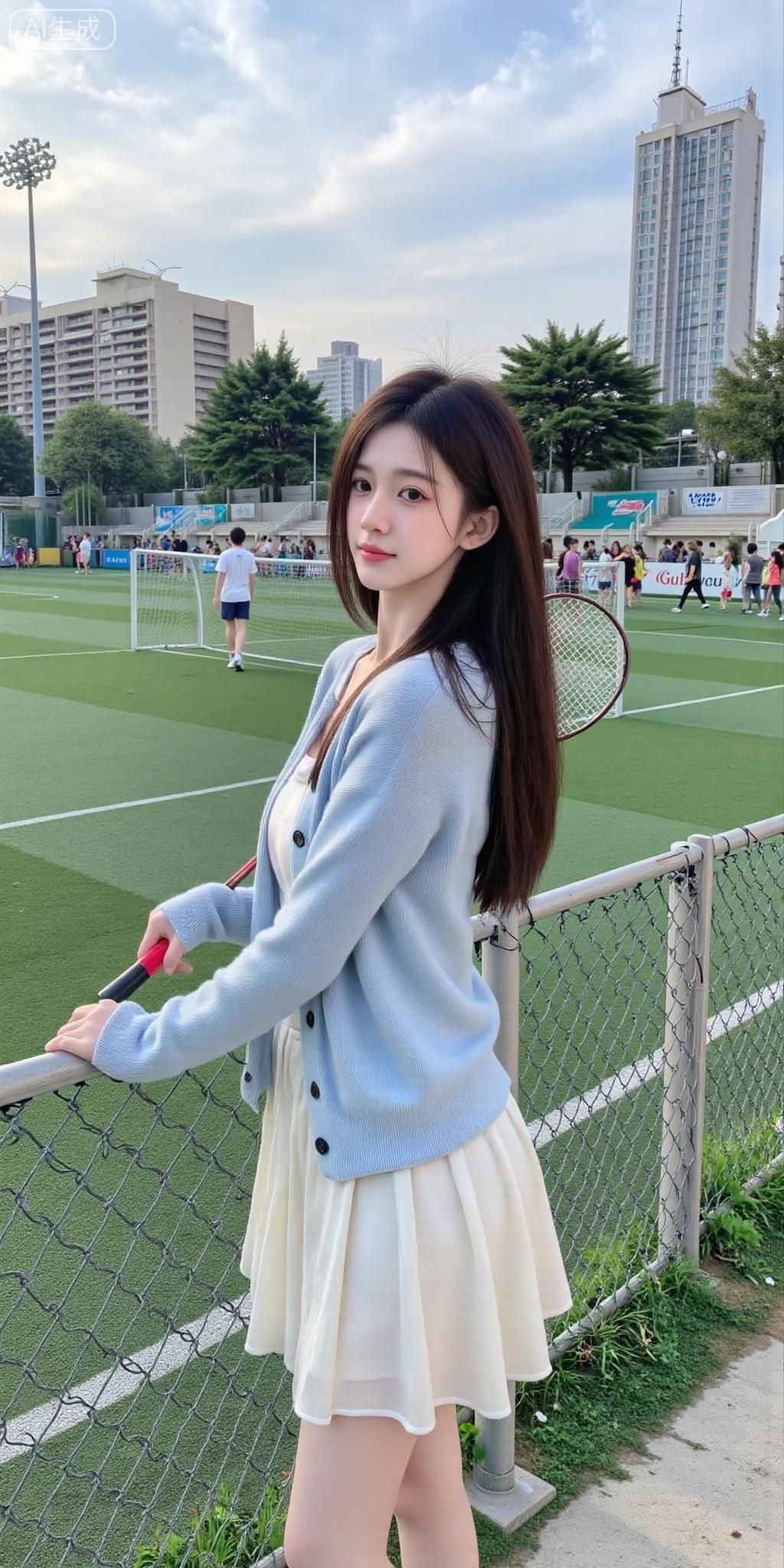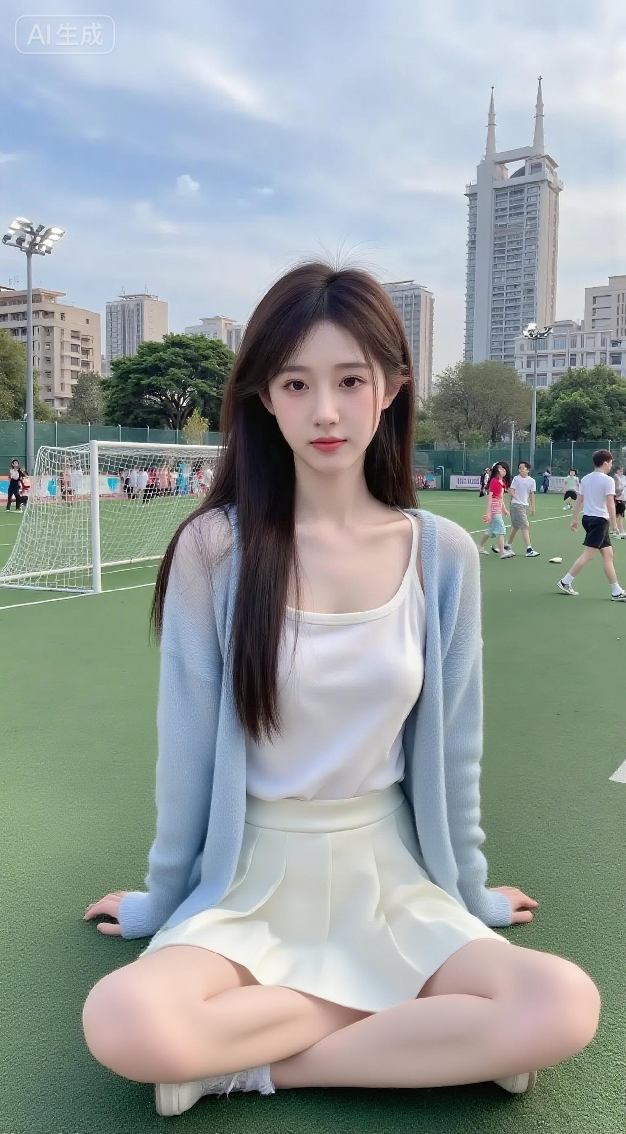 操场的风裹着青春气,浅蓝开衫搭奶白裙,长发垂在肩头的她,像把春日的温柔揉进了晴朗