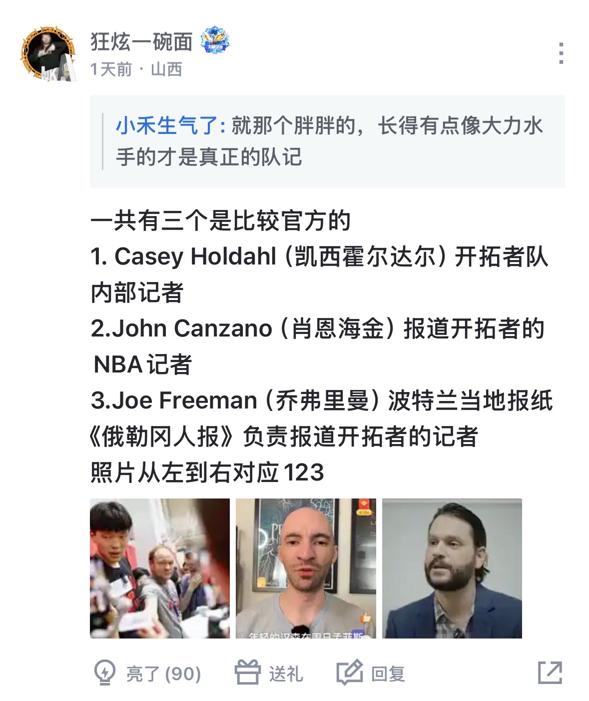 今天给大家介绍一下真正的开拓者队记: 1. Casey Holdahl(凯西霍尔达尔)开拓者队内部记者2.John Canzano(肖恩海金)报道开拓者的NBA记者3.Joe Freeman(乔弗里曼)波特兰当地报纸《俄勒冈人报》负责报道开拓者的记者照片从左到右对应123(本文出处来自图4)