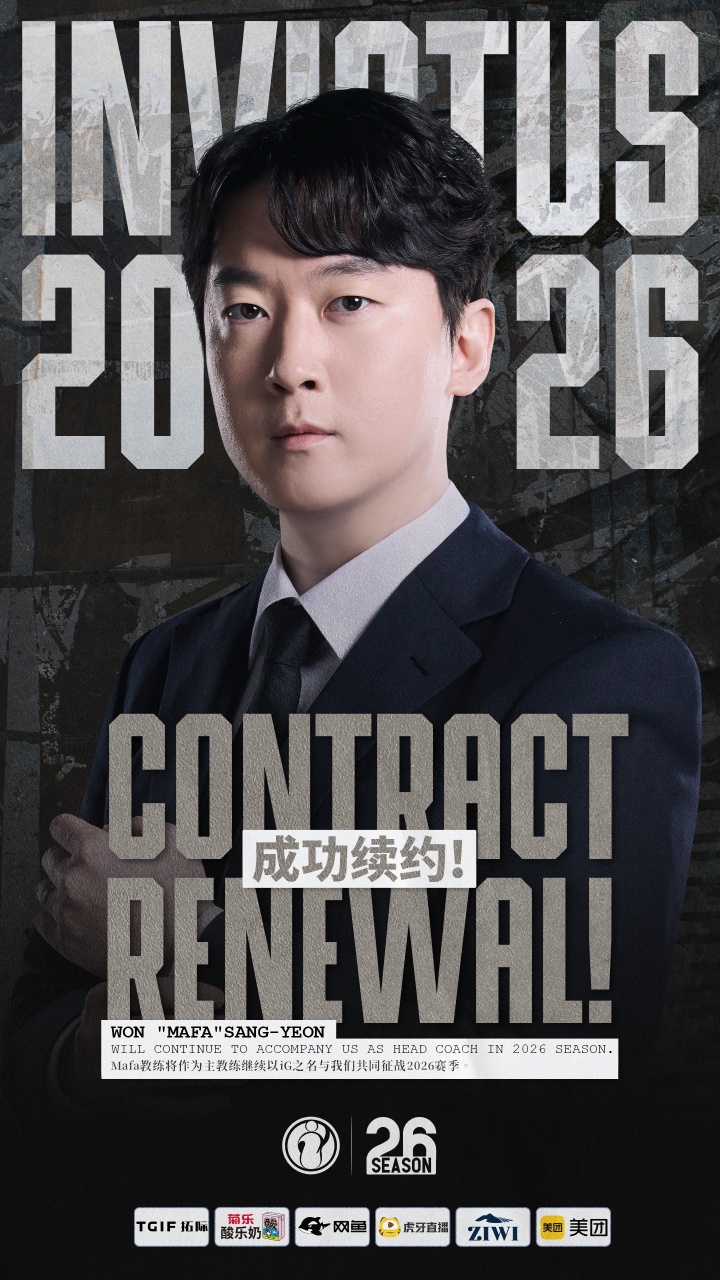 经过与本人的积极沟通以及友好协商后,我们高兴地向大家宣布:教练元祥渊(ID:Mafa)即日起将担任iG英雄联盟分部主教练,同时教练李炳權(ID:KaKAO)将回归iG,以副教练身份加入赛训组。