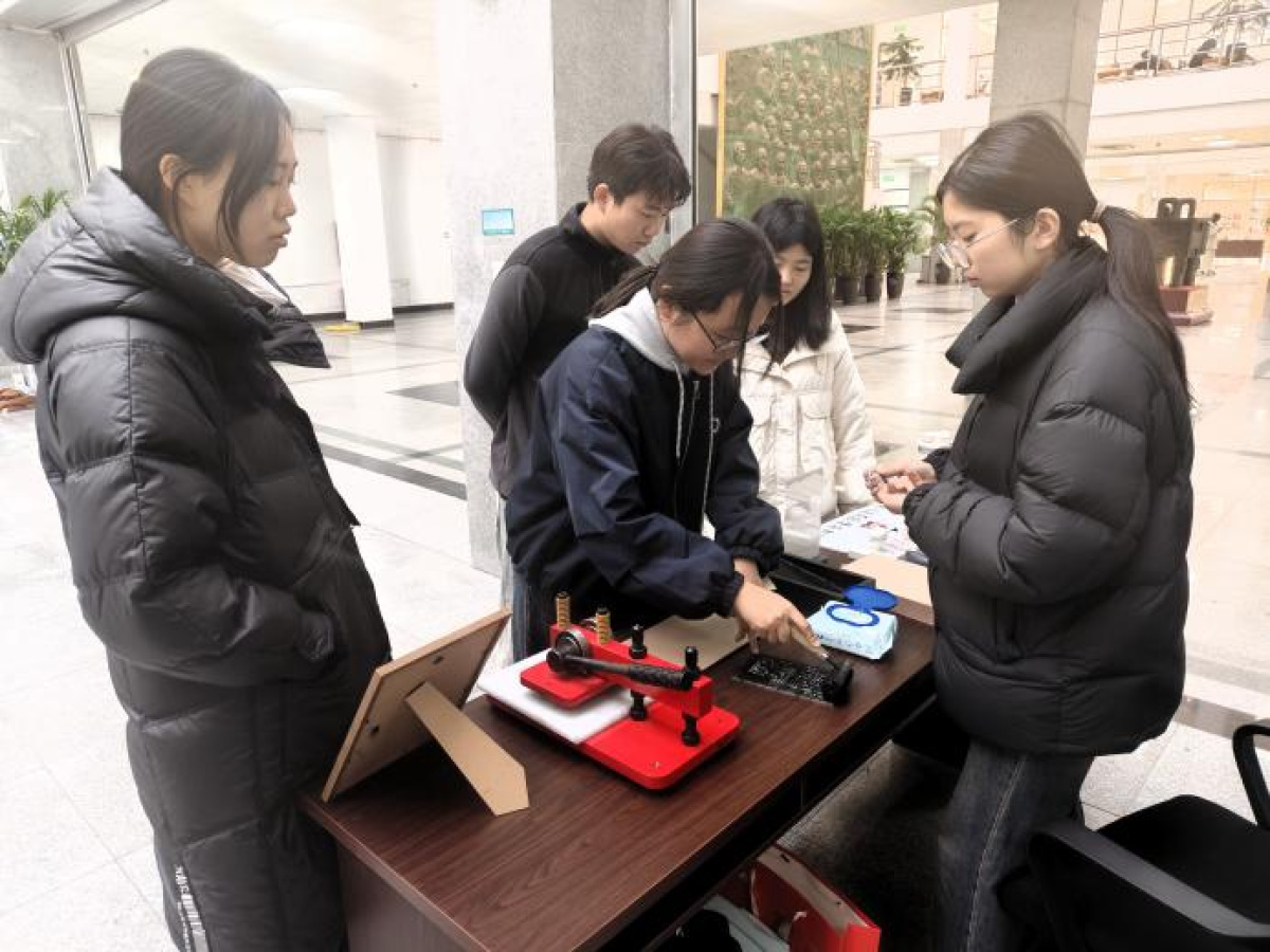 互动体验区更是人气爆棚,10余项沉浸式项目让师生们直呼“过瘾”。生肖拓印摊位前,刘恬伽刚完成生肖狗拓印,便被同伴们围住欣赏,她分享道:“拓印要顺着雕版纹路轻轻扑打,力度一定要稳,才能还原生肖纹样的细节!”活动现场,传统纹饰绘团扇、榫卯手工木作、手工银票制作等项目同步开展。学生们或在扇面上勾勒传统纹样,或专注拼接鲁班锁,或制作古制银票,在触摸历史文脉、参与实践操作的过程中,感悟传统文化的时代生命力。