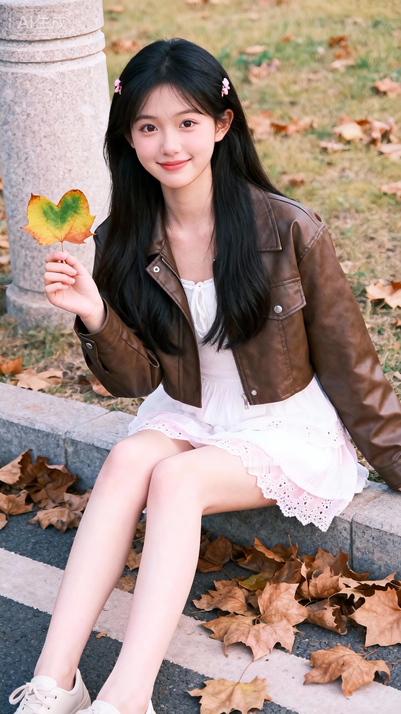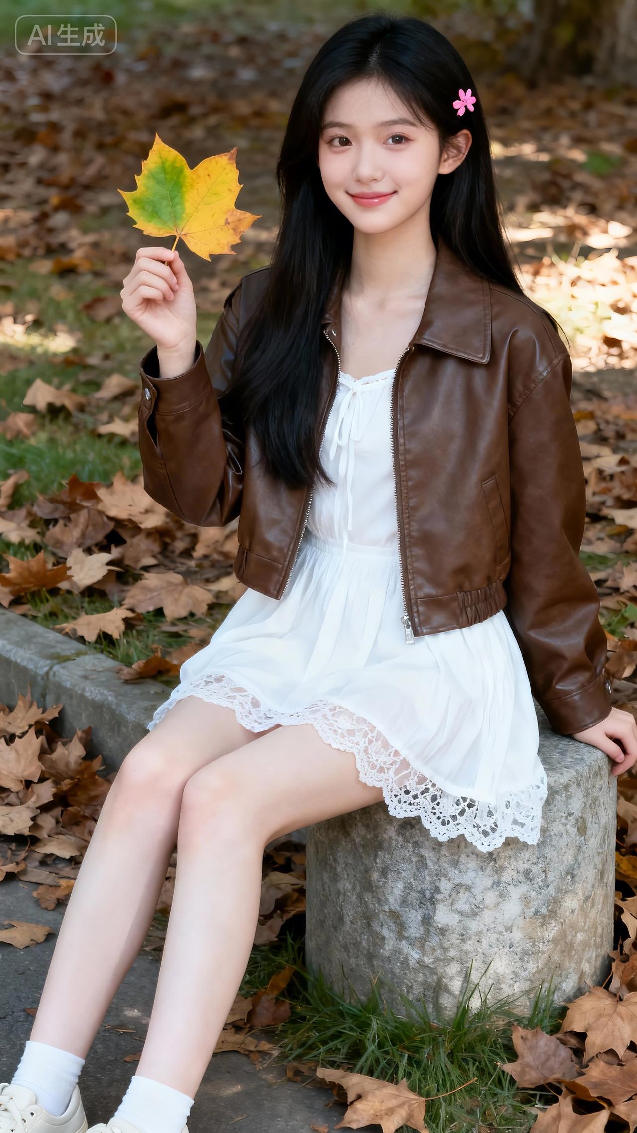 秋光裹满石阶,棕皮衣搭白蕾丝裙,发梢别着粉花的她,指尖捏着半黄枫叶笑眼弯弯——连