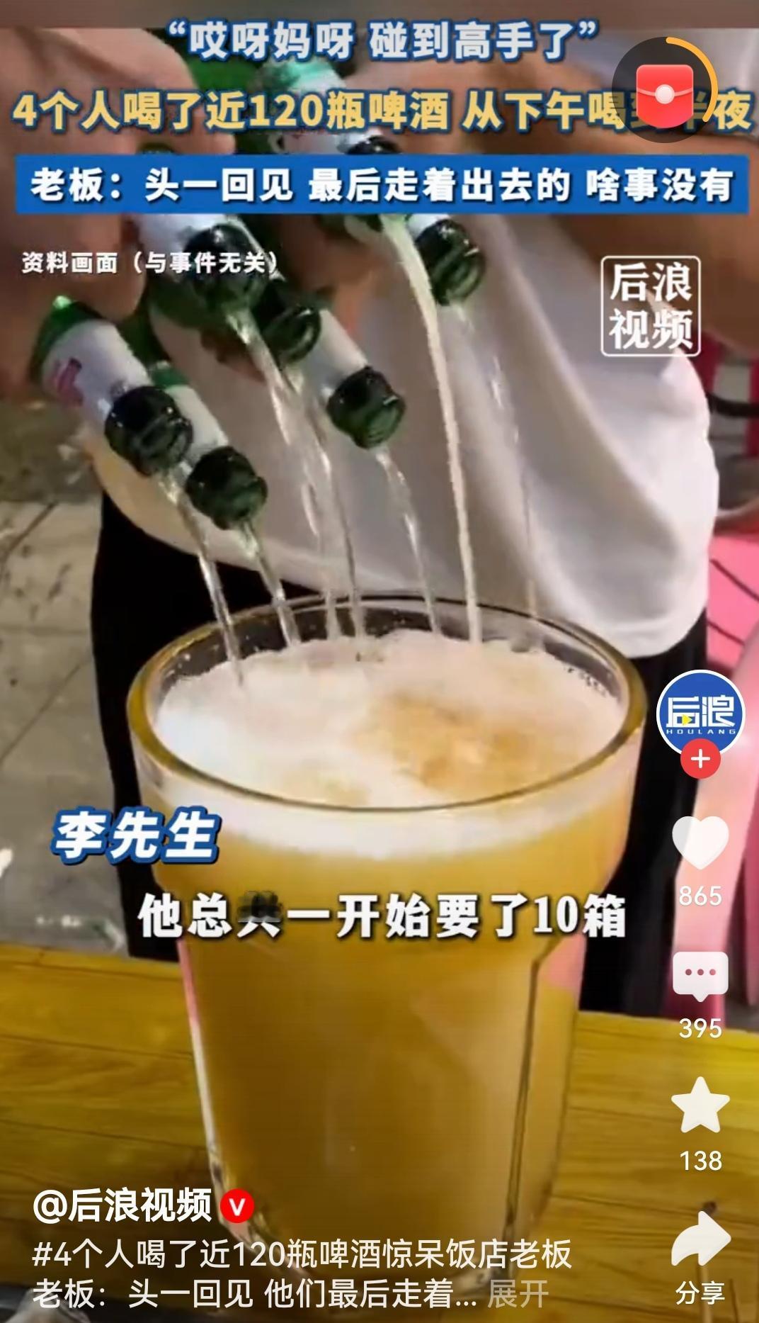 4人喝近120瓶啤酒惊呆老板这波操作看着是挺震撼,但喝酒还是得量力而行呀!健康永