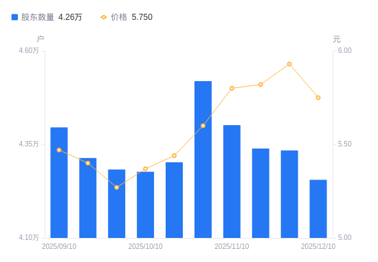 日期A股户数(户)流通A股户均持股数(股)户均持股市值(万元)2025-12-104255411730.376.742025-11-284334011517.636.832025-11-204339211503.836.702025-11-104401311341.516.582025-10-314519311045.386.192025-10-204302311602.496.312025-10-104277011671.126.272025-09-304283111654.506.142025-09-194313711571.836.252025-09-104395411356.746.21
