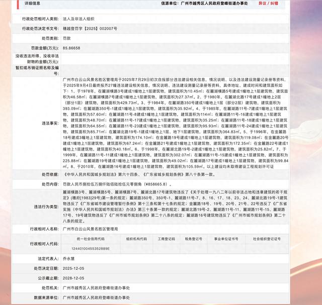 该行政处罚由广州市越秀区登峰街道办事处于12月5日作出,罚款858665.8元。行政处罚书显示,今年7月29日,广州市白云山风景名胜区管理局初次自报部分违法建设相关信息,包括情况说明、违法建设测量记录册等资料,并于9月4日最终报齐27幢违法建设相关信息,包括情况说明、违法建设测量记录册等资料。