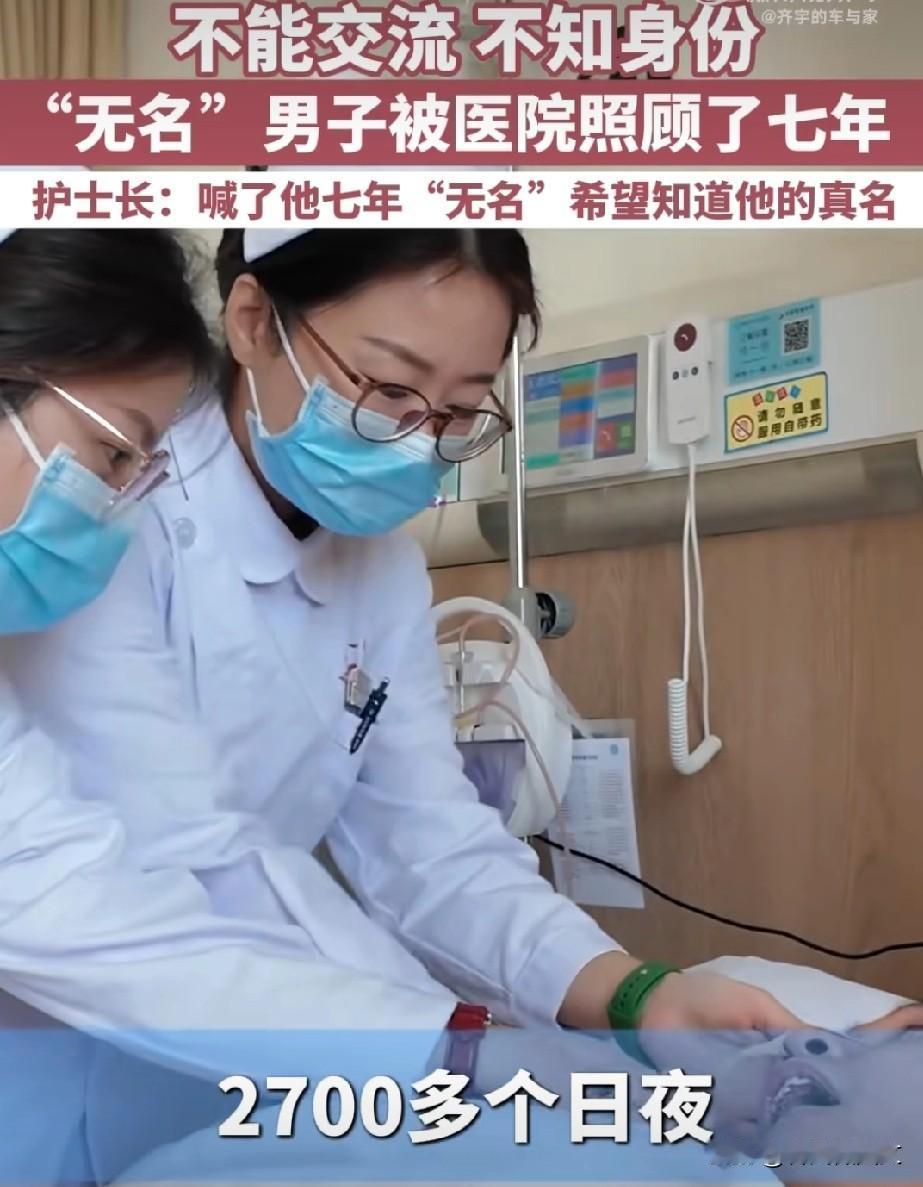 【2700多个日夜的无名守护!病床上的植物人男子,他的“家人”让人心头一暖】 “大家都喊他‘无名’,但心里早就把他当成自家人了!”在江苏句容市人民医院,有位植物人男子已经在病床上躺了7年半。这些日子里,护士们每天轮流给他擦身、喂饭,一勺一勺地喂,生怕他呛到;医院也一直默默承担着他所有的医疗开销,从检查到用药,一分钱没让他和“家人”犯过难。 时间拉回到2018年,当时有人把他送到医院,送来的时候他已经没有意识了。就这样过了2700多个日夜,护士长说,这些日子里的每个细节她都记得清清楚楚:每天要给他鼻饲营养液3次,每次的量都得仔细算好;每过2个小时就得给他翻一次身,防止长褥疮,这些事护士们每天都在重复。更让人心里发酸的是,护士们每天都会对着他轻声说话,就盼着他能有一天醒过来,哪怕只是万一能听见呢? 最近医院总算是等来了转机——警方已经开始帮他做DNA比对,现在全网都在帮这个“没有病历的人”找家人。 网友们也都在讨论:有人说医院真的太暖心了,也有人觉得“早就该找他的家人了”。但更多人还是被这份坚持深深打动了:“这哪是普通的病床啊?分明就是一个充满爱的港湾!”现在,你愿意为这份跨越7年的温暖点个赞吗? -search.byteimg.com/img/tos-cn-i-qvj2lq49k0/5441462070504d1ca580bdf18b95c1a0~480x480.png